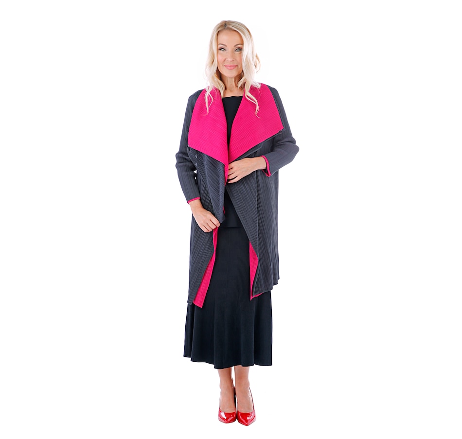 • Long sleeve, lined, waterfall, mid-length, reversible