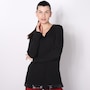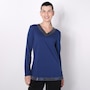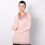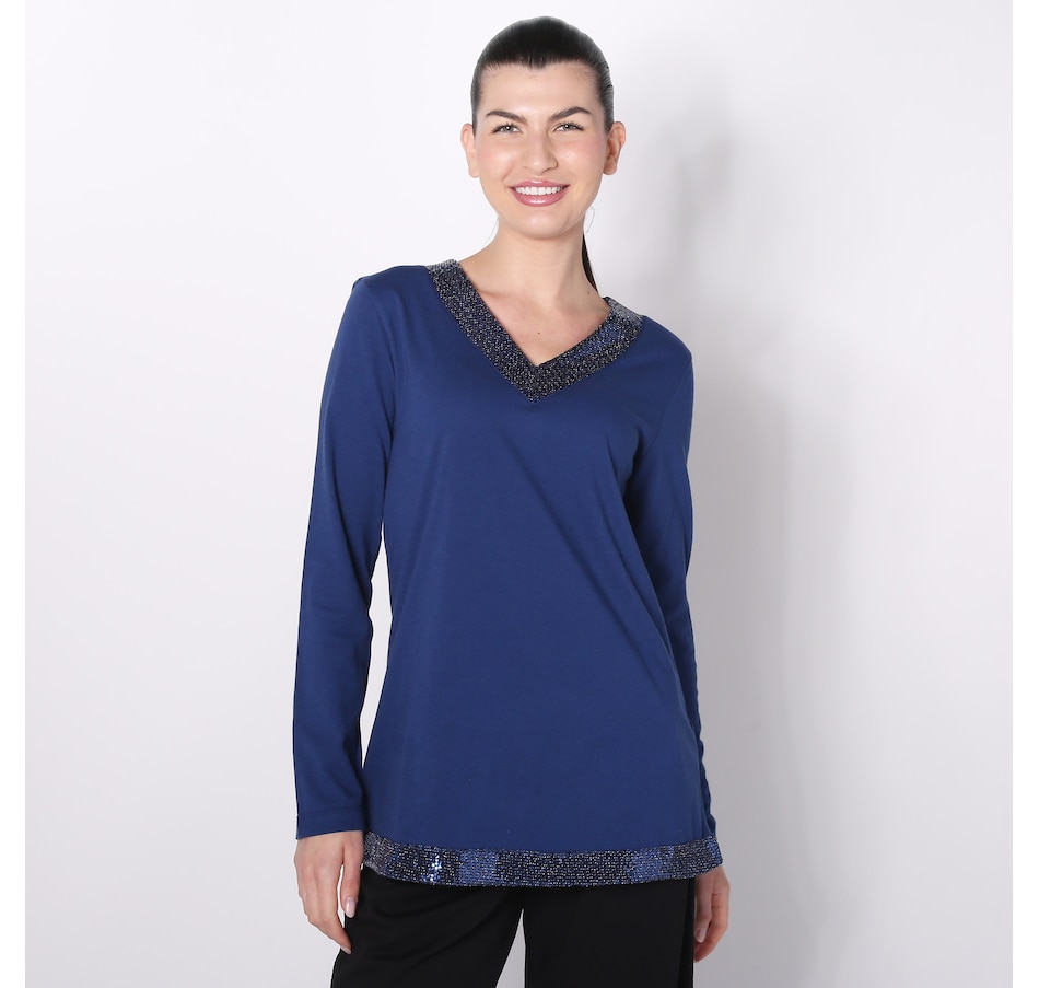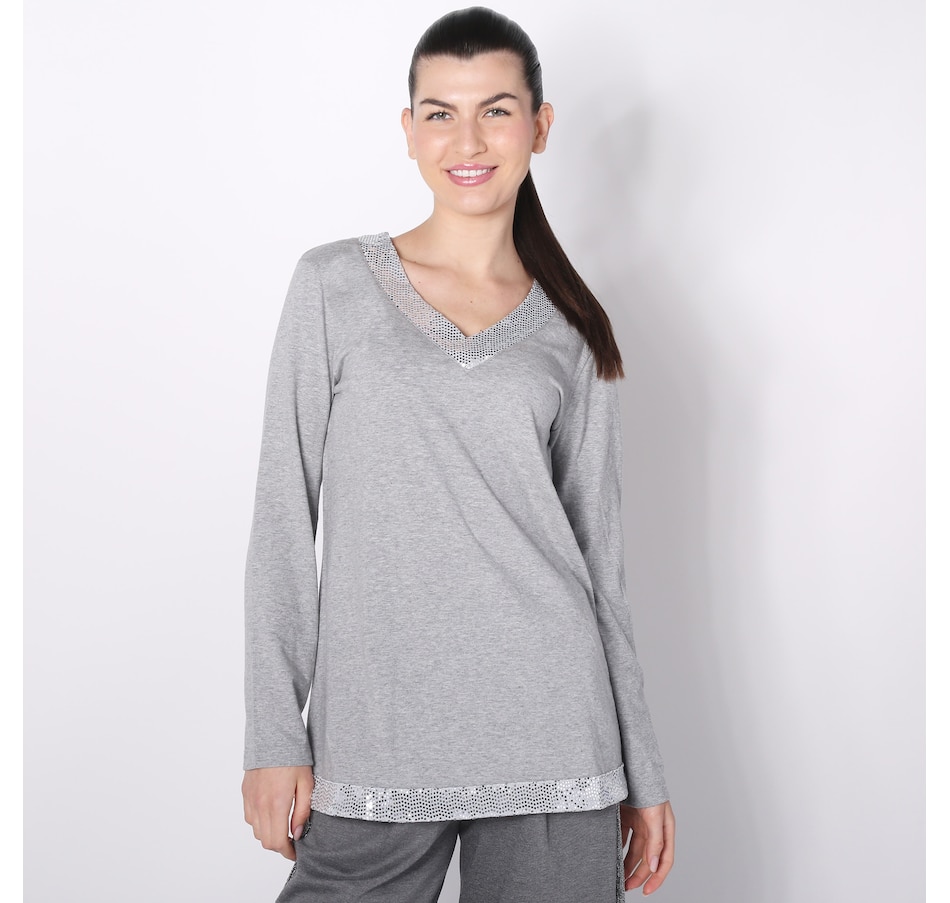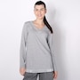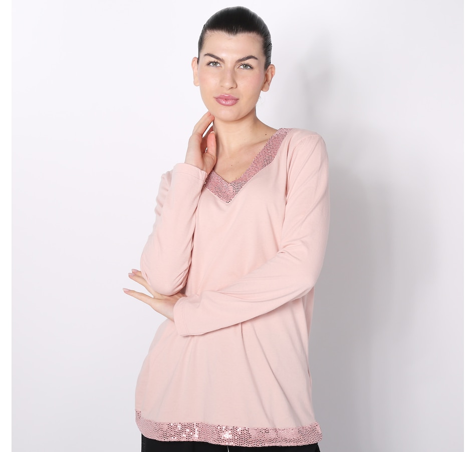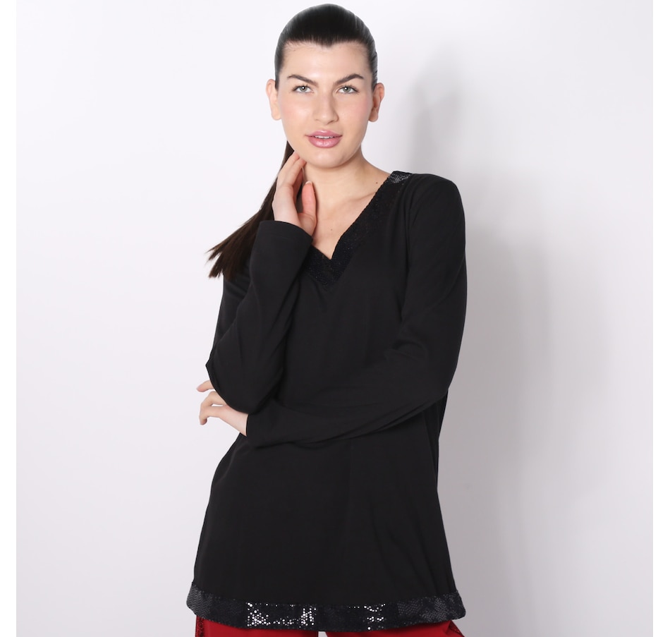 The Mary from Preloved is a long sleeve V-neck top with sequin trim on the hem and neckline. The body is made with 100% cotton jersey (and 50% recycled yarn.) It finishes with the familiar Preloved upcycled red heart patch on the back.