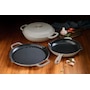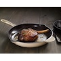 This skillet is made of enameled cast iron and features a pouring spouts for draining out liquid, as well as a long handle and a helper handle for ease of use. Its robust coating allows for superior heat retention and distribution.