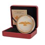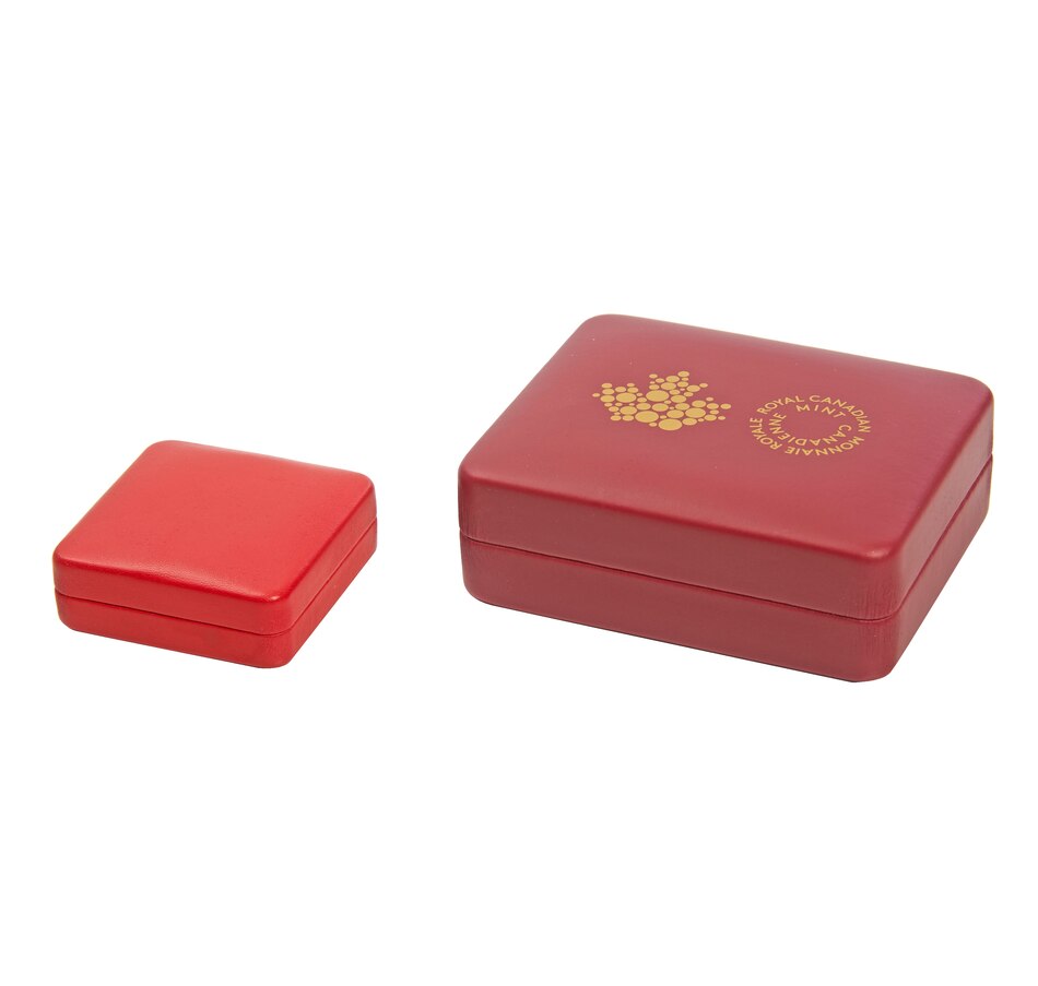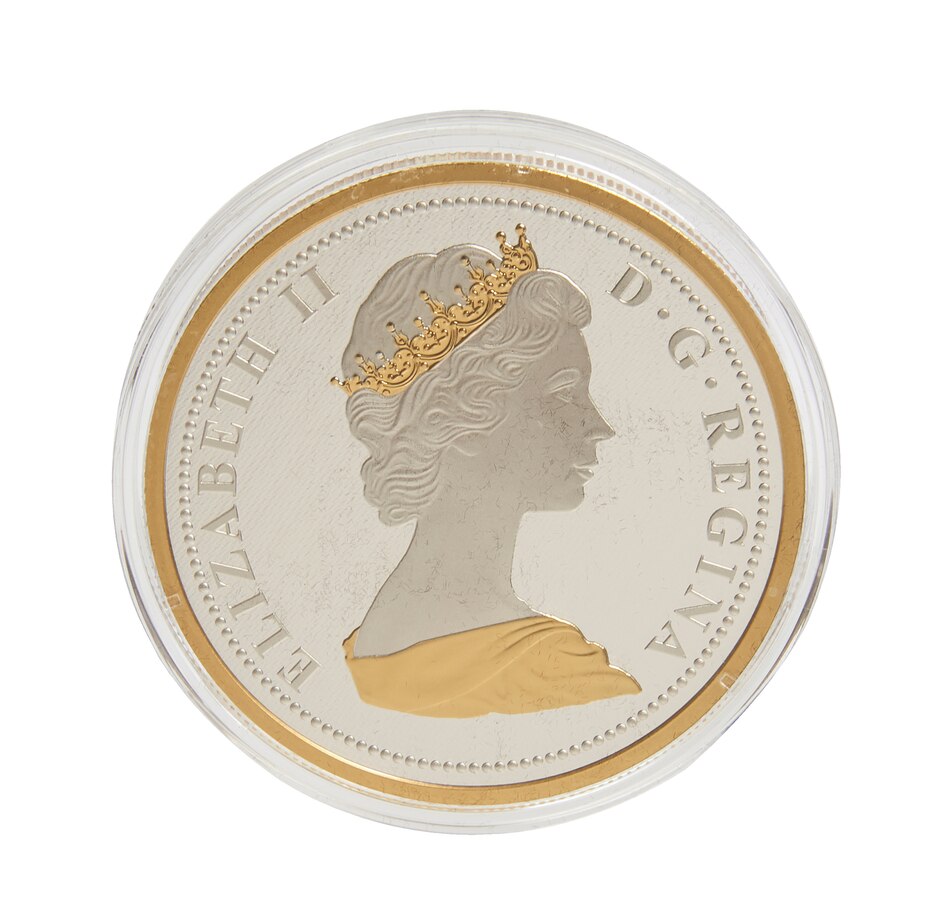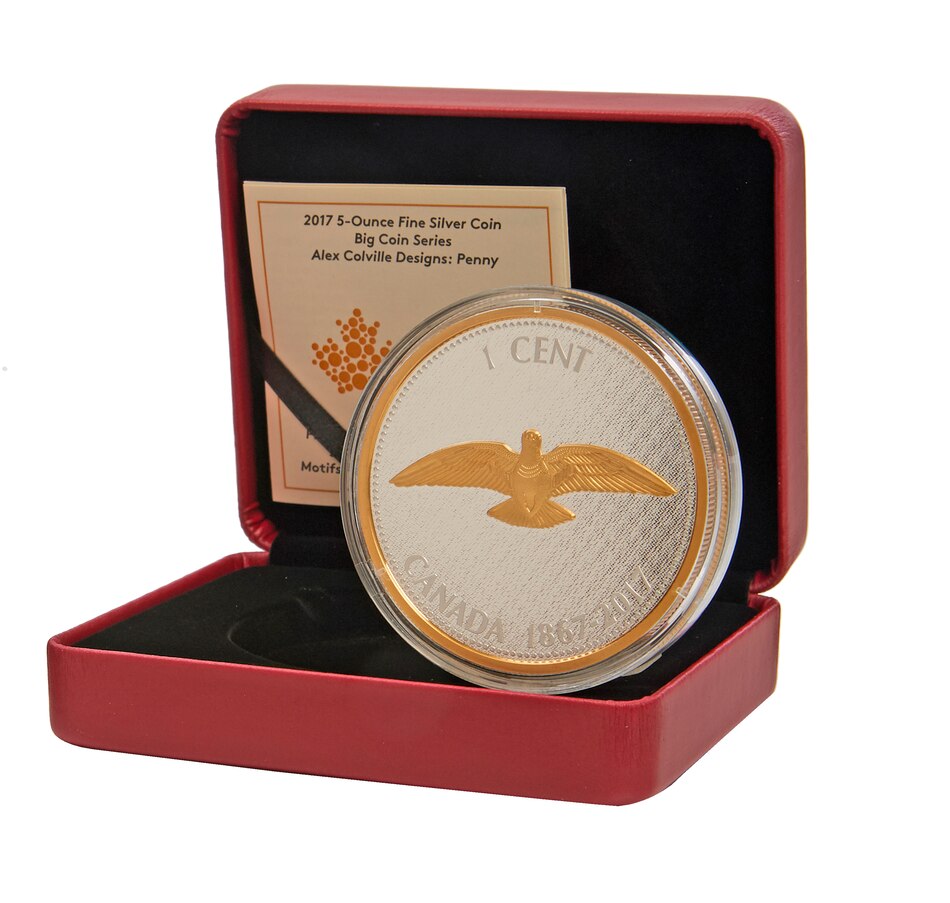 The design, originally created by renowned artist and sculptor Alex Colville, presents a rock dove, associated with peace and spiritual values. While the original 1967 version was struck in about three grams of copper, this new 2017 version has grown to a 65-mm diameter with a weight of five ounce of pure silver. The finish on the Big Coin is the finest-quality double-struck proof, and the wolf has been enhanced with a layer of 24-karat gold, creating a spectacular work of numismatic art. Even the obverse portrait of Queen Elizabeth is special, featuring the effigy in use in 1967 with selective gold plating on the Queen's gown.