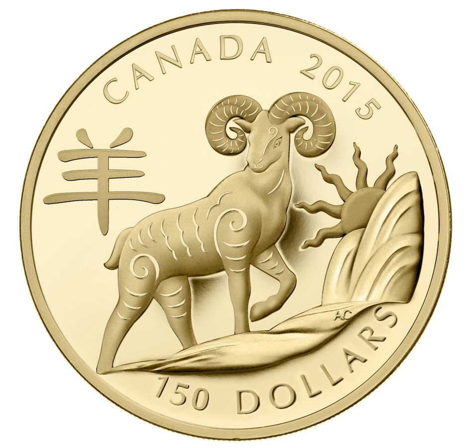 This $150 proof gold coin is a celebration of Chinese-Canadian culture, embodied by an illustration honouring the ancient Chinese zodiac. The year 2015 is ruled by the sheep, one of the 12 animals assigned to this zodiac; these animals are symbolic representations of how others perceive you or how you present yourself, although there are many complex layers involved in the actual interpretation of specific birthdays.