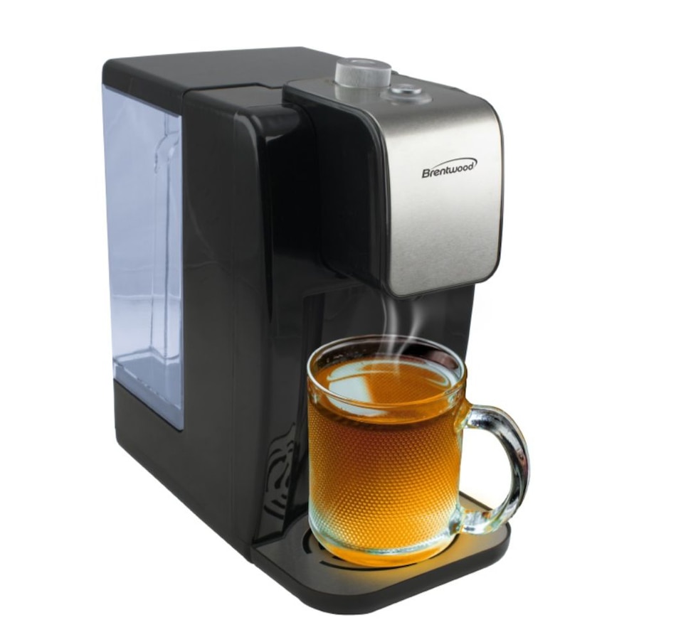 Use the powerful Brentwood KT-2200 2.2L 1800w Single Touch Instant Hot Water Dispenser to prepare your favorite hot drinks. Enjoy any variety of tea, hot chocolate, coffee, a squeeze of lemon, and more with a single touch. Dispenses a 6 ounce serving of water under 10 seconds. Adjust the temperature between 115° and 212° Fahrenheit. The large 2.2 liter tank holds 12 servings. The tank is removable and has water level indicators for convenience. Our hot water dispenser accommodates mugs up to 6” tall. Suction cup feet keep the dispenser securely in place. Detach the drip tray for quick cleanup. The unit is entirely BPA free and FDA approved. Jet black finish with stainless steel accents every countertop.