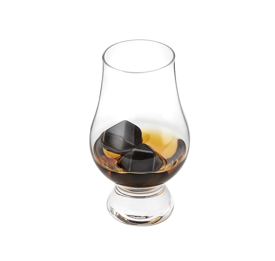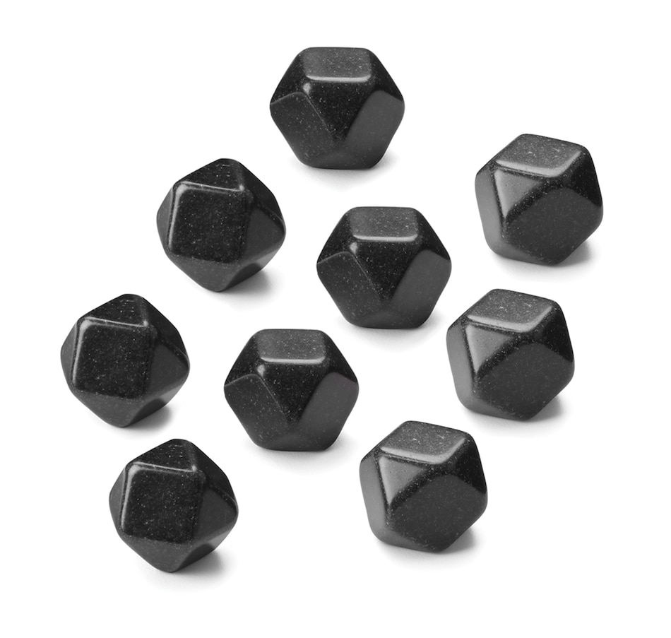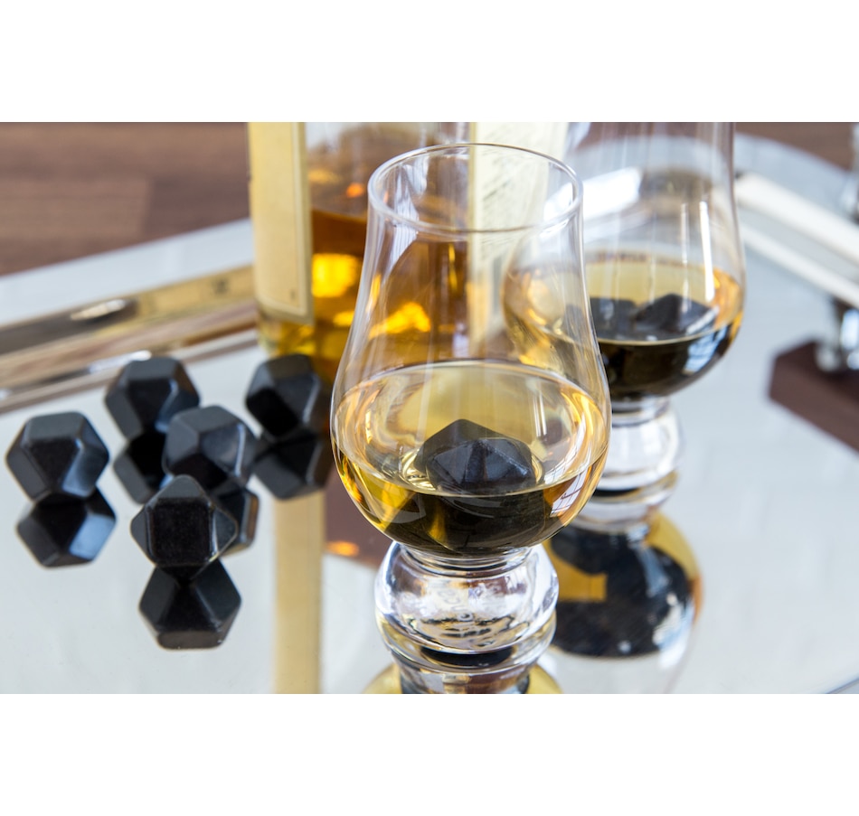 The solution to diluted drinks is here! Chill whiskey and spirits without watering them down with this set of nine polished black granite whiskey stones. They stay cold longer than ice and will add a touch of elegance to your beverage. Simply place the stones in the freezer, and in a few hours they'll be ready for use! Included is a convenient black velvet storage bag for easy transporting or storing when not in use. Now you can enjoy a whiskey on the rocks, literally!