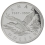 This 1987–1997 proof sterling silver dollar was issued to commemorate the 10th anniversary of the loon dollar. Canadian artist Jean-Luc Grondin chose to portray the loon in that dramatic moment of simple primitive power just before flight. The back bears the effigy of Her Majesty Queen Elizabeth II by Dora de Pédery-Hunt.