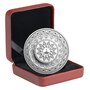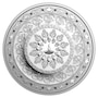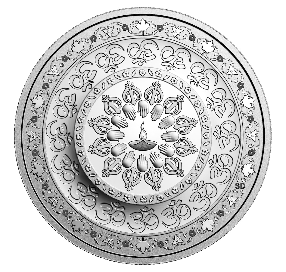 Inspired by the elaborate patterns of Indian textiles, ornamentation and mandalas, the reverse design by Canadian artist Sarindar Dhaliwal presents a visually stunning celebration of Diwali as a cherished multicultural tradition in several communities across Canada. The outermost ring offers a Canadian twist on the patterned inlay that famously adorns the Taj Mahal, using intricately engraved trilliums and Pacific dogwood blossoms to represent Canada's largest Indo-Canadian populations in Toronto, ON., and Vancouver, B.C. Alongside these provincial floral emblems is Canada's own iconic national symbol, the maple leaf, which reflects a spirit of inclusion and the thriving cultural diversity that defines this nation. Symbols from the Hindu, Sikh and Jain faiths form a series of rings that frame the center, where the silvery shine of the engraved clay lamp (diya) poignantly captures the luminous essence of this ancient tradition known as the Festival of Lights.