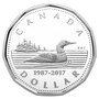 The first coin features the design by Canadian artist Robert-Ralph Carmichael that has become synonymous with Canada's currency: the iconic side-profile portrait of a common loon on a still lake, where it floats past the Group of Seven-esque trees rising up on a small island behind it. The entire scene is representative of the lakes that dot the Canadian Shield across much of the nation, and includes the engraved words "CANADA" and "DOLLAR", along with the commemorative dates "1987-2017" to mark the 30th anniversary of Canada's $1 circulation coin.