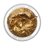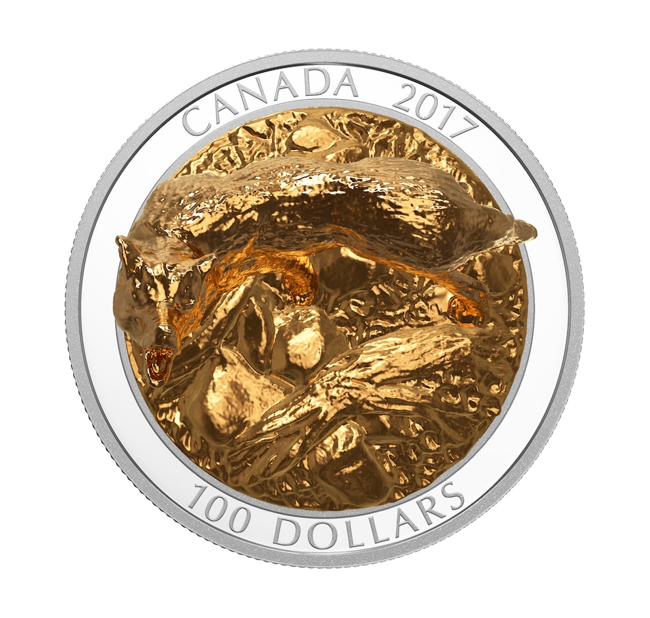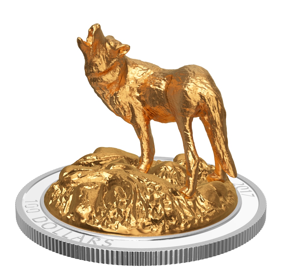 This stunning full three-dimensional wolf coin is a part of the most revolutionary coin series ever issued by the Royal Canadian Mint. Since the first coins of the world were struck more than 2,500 years ago, coin designs have been confined to two-dimensional coin blanks and the limited relief of traditional minting. The Royal Canadian Mint brings some of Canada's most iconic animals to life with a full three-dimensional sculpture rising up from the surface of the coin. The coin has a $100 face value and weighs just over 10 ounces of pure silver. The striking 3D wolf is further enhanced by an overlay of 24-karat gold. In addition to its artistic beauty, collectability of this revolutionary coin is further heightened by an extremely low limited mintage of just 1,200 pieces.