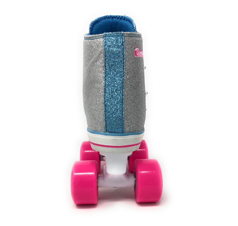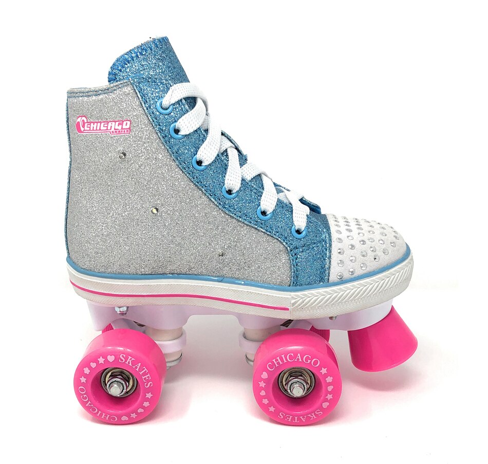 The Iconic Junior Fashion Quad Roller Skate from Chicago Skates has just been given a makeover with glitter and lights! The Chicago Fashion Skate features a controlled high top for optimum safety as well as high-quality glitter laces for maximum protection, leaving your foot feeling comfortable and secure. Equipped with 54-mm urethane wheels, you'll be protected gainst the normal wear and tear of skating, providing traction and control, while the semi-precision bearings keep you rolling smooth and fast. The skate features a silver and teal glitter high-top profile rink-style boot that supports your ankles while skating and a speed hook lacing system that allows you to adjust the fit as you go. Start having fun—start skating with Chicago Skates!
