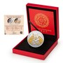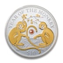 Celebrating the Year of the Monkey, the coin depicts a pair of mischievous-looking monkeys facing one another. Both the monkeys and the flowers on the branch above their heads feature a gilded finish of 24-karat gold, and there is also an engraving of "Year of the Monkey" on the face of the coin.