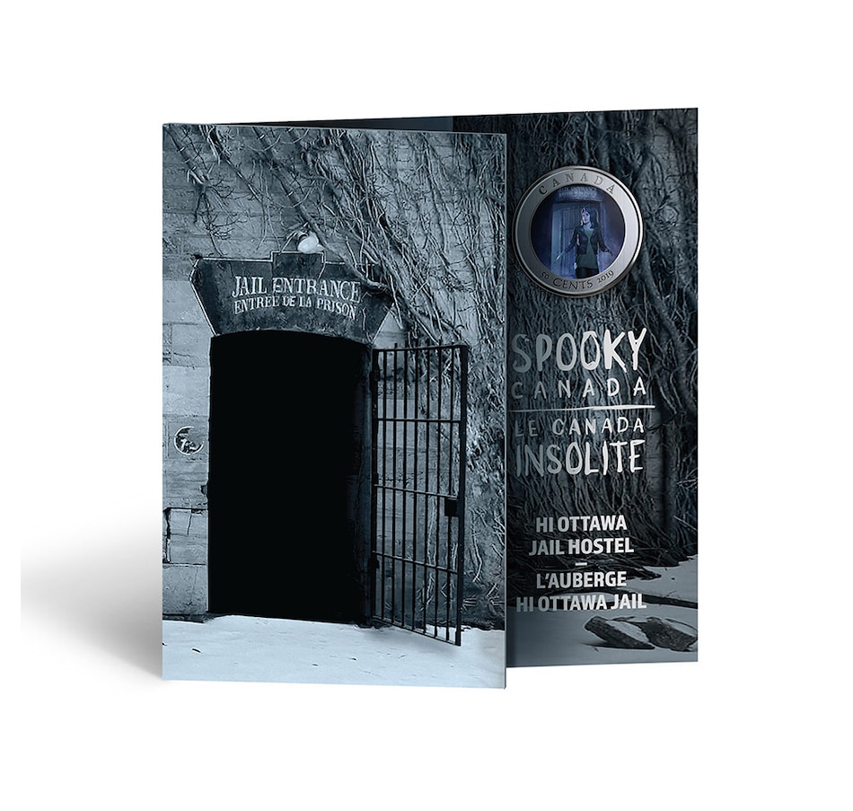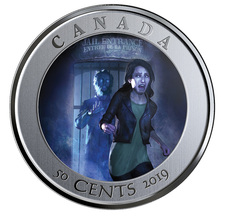 This lenticular, large-format, 35-mm, 50-cent coin brings you a ghostly tale set in one of Canada's spookiest buildings. The two-image lenticular design by Emmanuel Julian Madail Monzon first shows a visitor entering the former jail during an evening tour, where the bar door is left ajar. When the coin is tilted, the door is closed and the eerie ghost of a former inmate—perhaps Patrick Whelan—appears behind the terrified visitor and looks directly at the viewer. The obverse features the effigy of Her Majesty Queen Elizabeth II by Susanna Blunt.