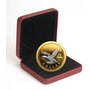 The design features a re-creation of the iconic flying loon design first created to mark the 10th anniversary of Canada's loon dollar in 1997. The design by Canadian artist Jean-Luc Grondin presents a striking image of a loon taking flight. Reverse gold plating fills the field while the coin's silver surface draws the eye to the engraved relief, which includes the words "Canada" and "dollar," and the date "2019." The reverse gold-plated obverse features the effigy of Her Majesty Queen Elizabeth II by Susanna Blunt.
