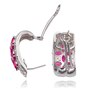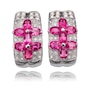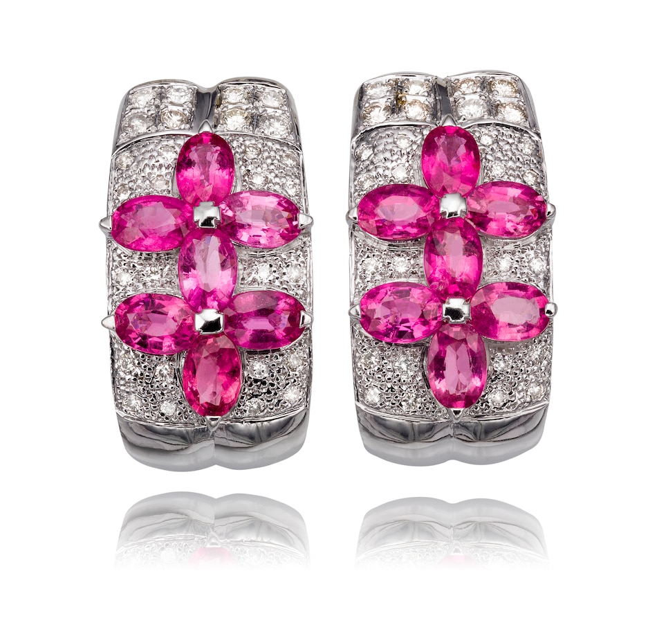 These bold and colourful curved shrimp style earrings are crafted in 14K white gold, and each features a long post and hinged back. A series of seven oval shaped pink sapphires form two stacked flowers on each earring; these flowers rest, just slightly raised, from a rectangular panel of twenty pave-set diamonds. Above the panel, toward the top of the earring, are an additional eight round brilliant cut diamonds, separated into two blocks of four. Below the panel is a ribbed curvature of high polished gold. When combined, the pair of earrings offer fifty-six round brilliant cut diamonds (1.40 carats) and fourteen pink sapphires (8.00 carats).