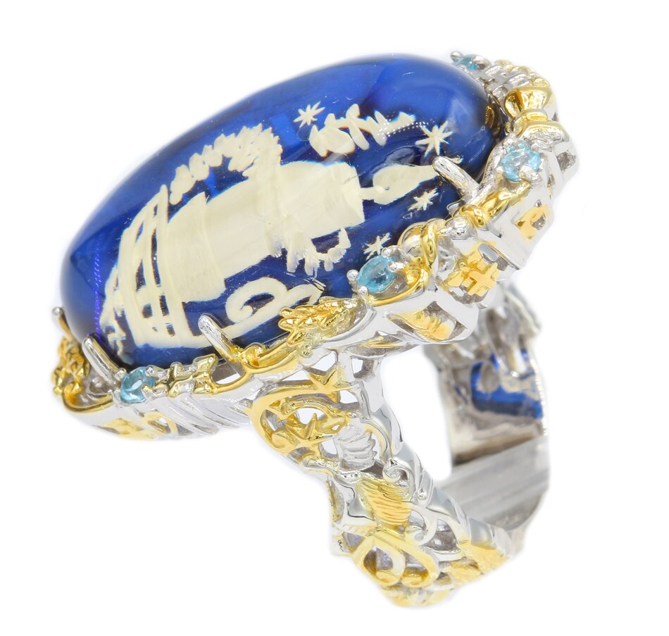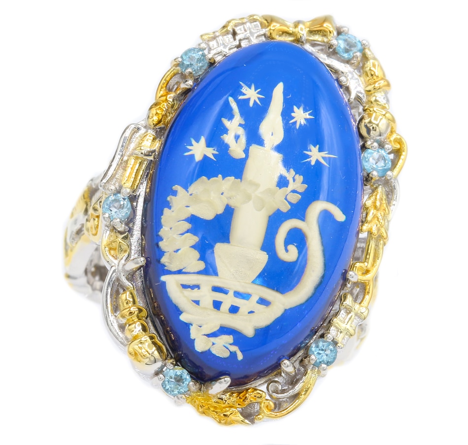 Palladium Silver Carved Candle Blue Amber Ring (Christmas Special)