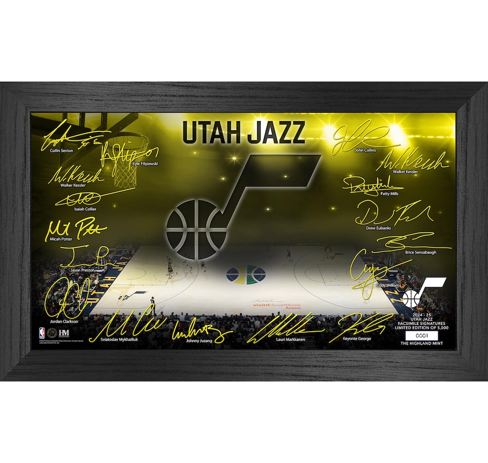 This Signature Court print features facsimile signatures of the Utah Jazz roster displayed around their home court. Each print is hand-numbered and comes in a 12" x 20" wooden frame with an acrylic glass front panel.