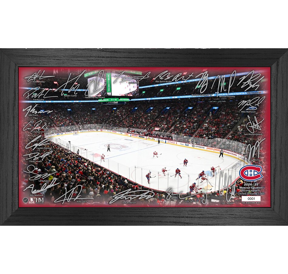 This 2024–25 Season Signature Rink features the facsimile signatures of the Montreal Canadiens roster around their home rink. Each print is individually hand-numbered and delivered in a 12" x 20" wooden frame with an acrylic glass front panel.