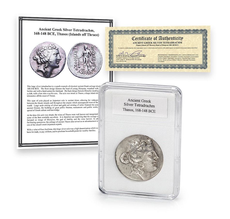 Ancient Greek Silver Tetradrachm, 168-148 BCE, Thasos, Superb High Grade Condition, Head of Dionysos