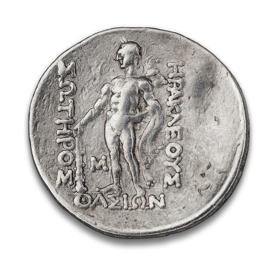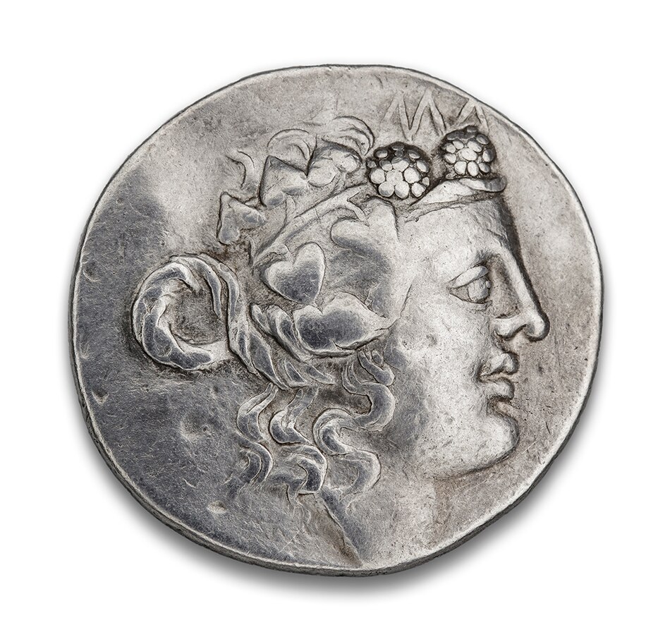 • Ancient Greek Silver Tetradrachm, Head of Dionysos, 168–148 BCE