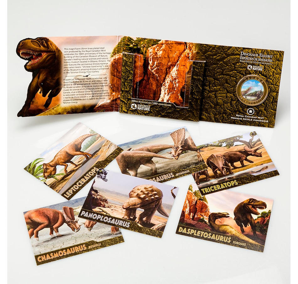 Sinosauropteryx is just one of many amazing dinosaur fossils on display in the Talisman Energy Fossil Gallery, and this fierce prehistoric carnivore springs to action here with a slight tilt of the coin! It's presented in a full-colour folder that also includes six trading cards that will fascinate and engage amateur dinosaur hunters and enthusiasts alike. The trading cards feature Panoplosaurus, Chasmosaurus irvinensis, Chasmosaurus russelli, Leptoceratops, Triceratops and Daspletosaurus torosus.