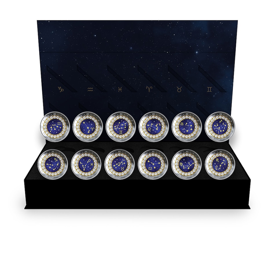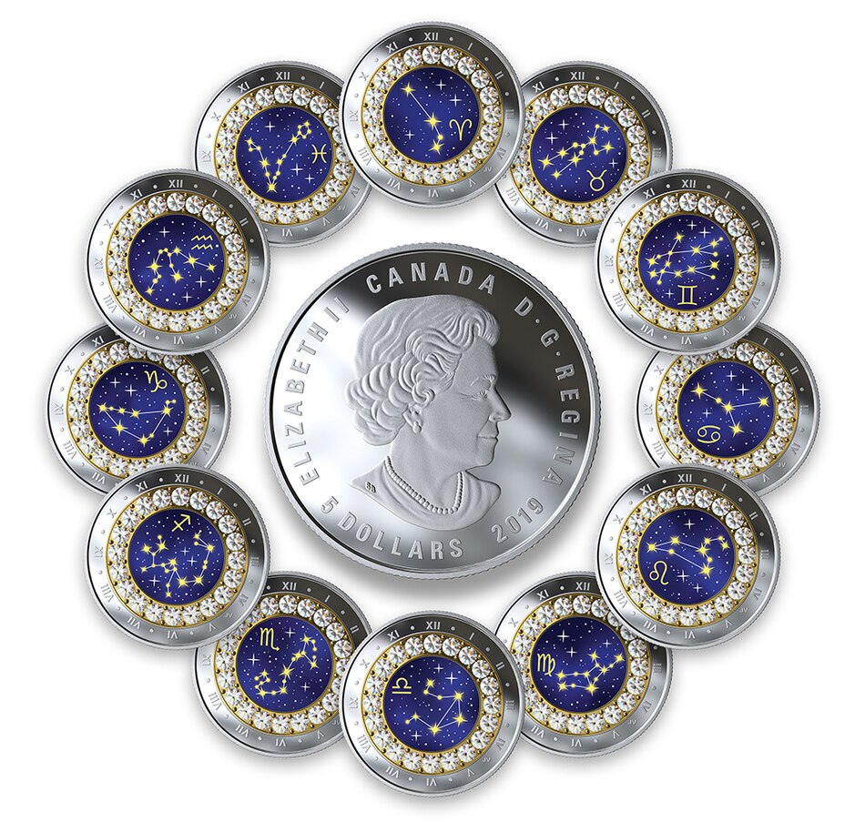 Own the entire 12 piece zodiac series and capture all the magic of the constellations as presented on these $5 fine silver coins, issued by the Royal Canadian Mint. The reverse image design by artist Jori van der Linde features an engraved outer ring of Roman numerals that capture the look of a classic timepiece. An inner ring of Swarovski® crystals surrounds a colourful zodiac-themed image, pairing the constellation and symbol associated with each of the 12 symbols: Capricorn, Aquarius, Pisces, Aries, Taurus, Gemini, Cancer, Leo, Virgo, Libra, Scorpio and Sagittarius. The obverse features the word "Canada", the face value "5 Dollars", the year "2019", and the effigy of Her Majesty Queen Elizabeth II by Susanna Blunt.