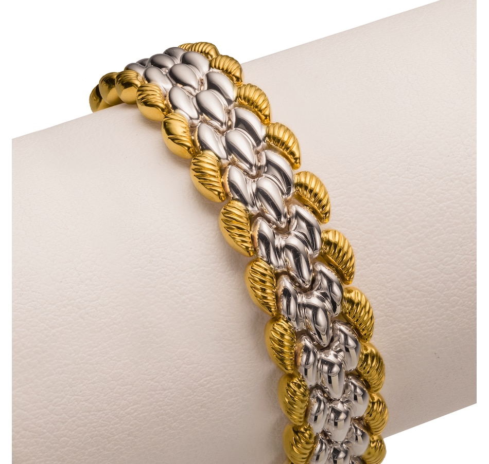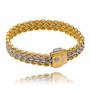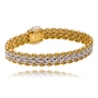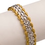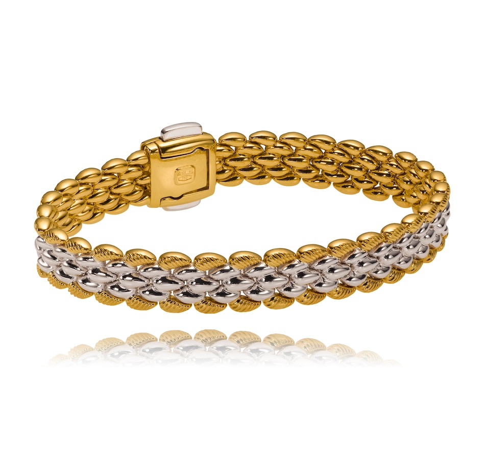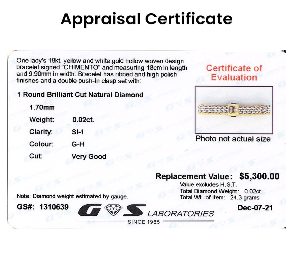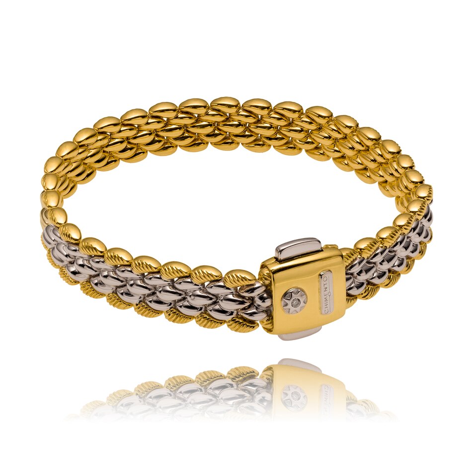 Two looks for the price of one! This bright 18KT gold Italian made bracelet is reversible presenting both white and yellow gold, on one side and all yellow gold, on the other. This stunning pieced is created by the design house of 'CHIMENTO'. CHIMENTO is synonymous with quality and excellence in creating uniquely designed jewellery, with timeless classics that express Italian gold at its best. The company was founded in 1964, in the renowned jewellery district of Vicenza, where the flair, passion and business acumen of founder Adriano Chimento took the brand to be an interpreter of Italian goldsmith quality and ambassador of Italian jewellery around the world. As a perfect mix between tradition and design, the Chimento collections express classic 18K gold Italian jewellery. "Our creations are exquisitely Italian in taste, designed for dynamic and demanding women who want a jewellery item which acts as a precious complement to her personal style, yet which is practical, versatile and perfect for everyday use." The bracelet is crafted in a 5-row woven design with one side offering puffed links in all yellow gold and the other side, a combination of a high polished white gold inner weave and textured yellow gold ribbed exterior. The bracelet measures 18cm (7.25") in length and 9.90mm in width and has a double push-in clasp, set with one .02ct round brilliant cut diamond.