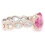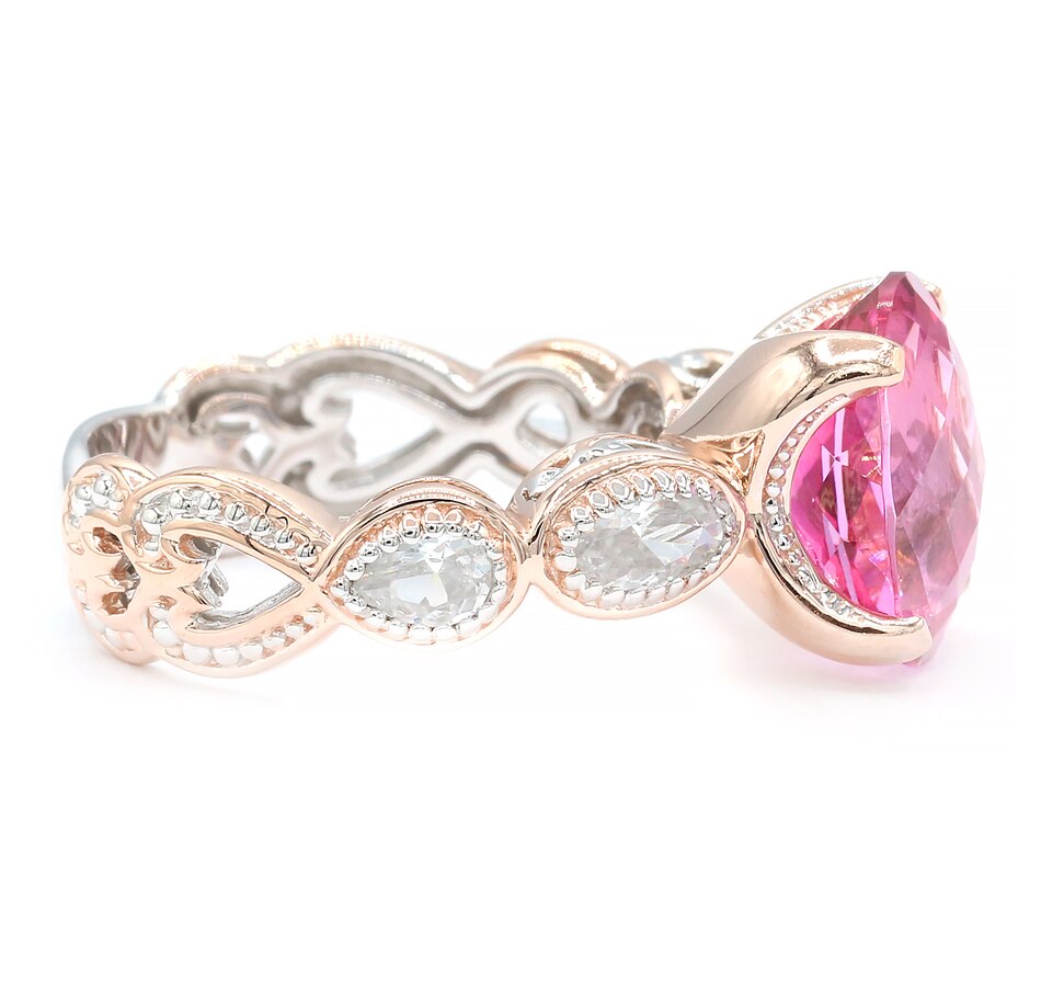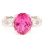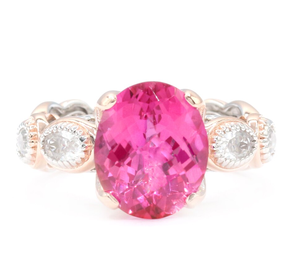 • (1) 10mm x 12mm oval shape, prong set and faceted pink topaz (5.25 av. ctw)