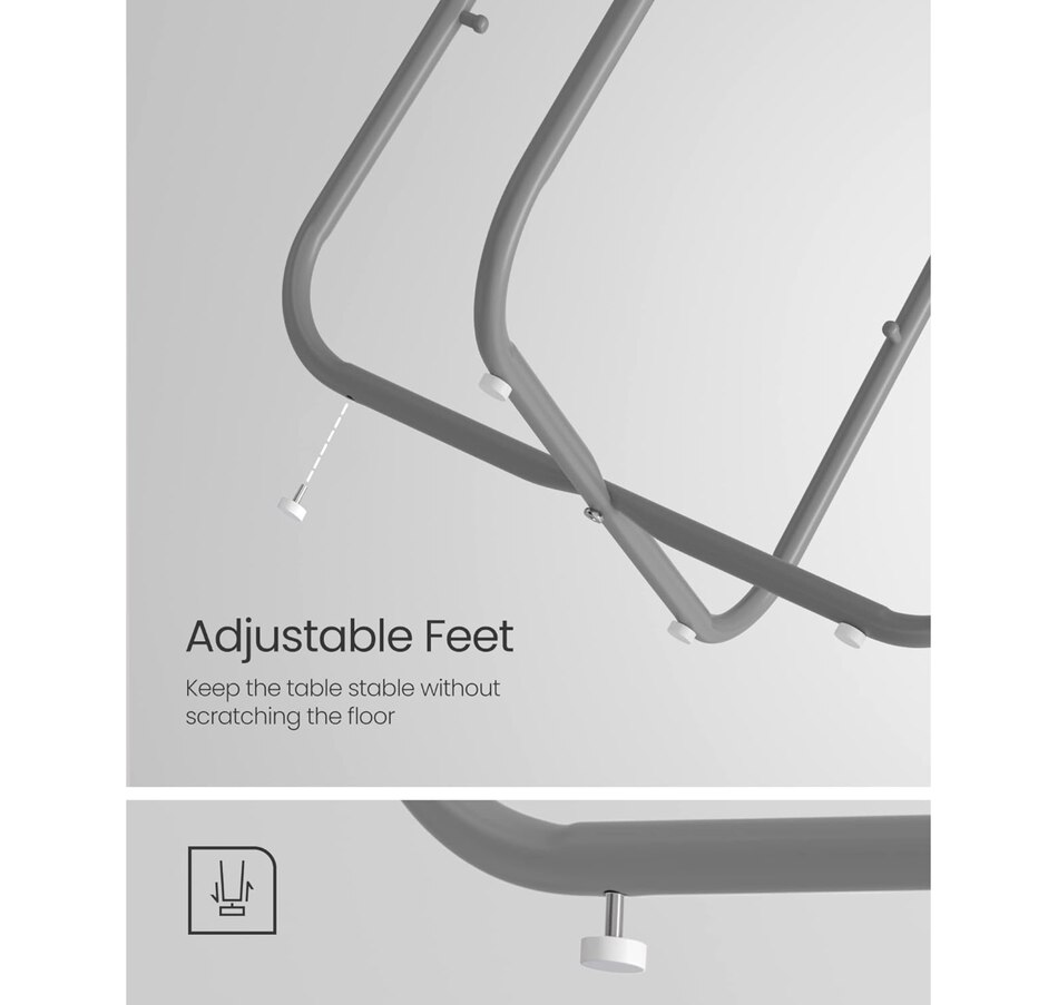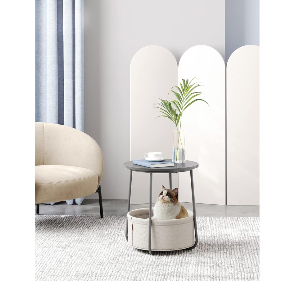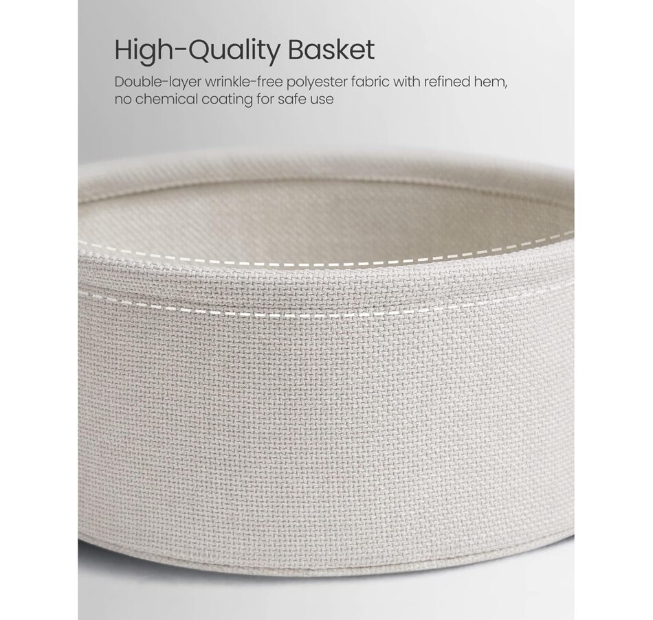 This side table is a breeze to assemble, taking just 5-10 minutes thanks to a simple structure and clear instructions. Tailored for small spaces, it's the ideal fit as a living room side table or bedroom bedside table. Despite its compact size, it offers plenty of storage space. The particleboard tabletop is firmly attached to the frame, creating stability without any wobbling, with solid support provided by the one-piece U-shaped steel legs. What's more, the adjustable feet not only enhance stability but also protect your floors from scratches. The table's aesthetics are further elevated by a double-layer, crease-free polyester fabric basket, which not only pleases the eye but is also chemically safe for use. Its linen-like appearance adds a unique touch to this compact piece. This simple yet stylish cement grey round coffee table, with a cloud white basket, effortlessly enhances the style of your living room or bedroom and seamlessly complements a variety of furniture styles.
