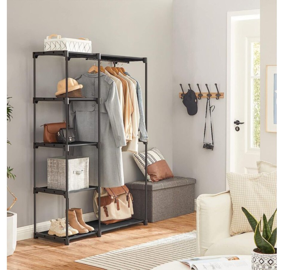 A versatile and practical addition to your home organization, this closet rack is designed to make life easier. It offers two generous storage areas for hanging clothes, as well as multiple shelves for neatly folded garments. Should you need to hang longer items, simply remove the middle shelf. Crafted with robust metal tubes and quality plastic connectors, this clothing rack ensures stability, capable of supporting up to 17.6 pounds per fabric shelf and 44 pounds per hanging rod. Its simple structure and neutral colour allow it to seamlessly blend into any room, be it the bedroom, living room, or an entryway. Assembly is a breeze, requiring no tools, thanks to clear instructions and marked parts. You can have this coat rack ready in no time! To enhance safety, an anti-tip kit is included, which secures this closet organizer to the wall, preventing accidental tipping and creating a safer living environment.