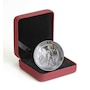 The reverse image by Alexandra Lefort depicts the battle between Thor and a giant sea serpent at an end-of-days event in Norse mythology. Clad in the finest clothing and armour of the Viking era, the Norse god of thunder stands with his hammer raised, ready to strike the coiled serpent. Selective gold plating highlights Thor's hammer, iron gloves and belt. A Norse-art-inspired pattern lines the rim on the obverse and reverse, which both feature an antiqued finish. The gold-plated goat heads represent Tanngrisnir and Tanngnjóstr, who pull Thor's chariot, while the gold-plated Mjöllnir is based on a 10th-century silver pendant. The obverse features the gold-plated effigy of Her Majesty Queen Elizabeth II by Susanna Blunt.