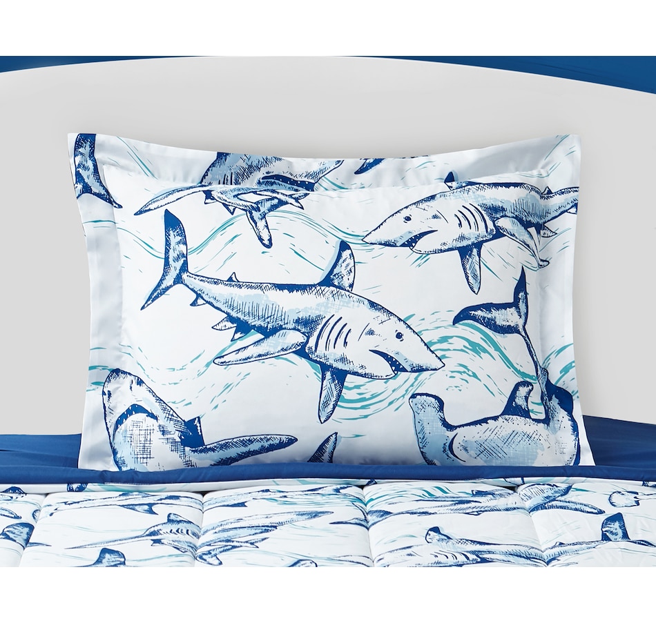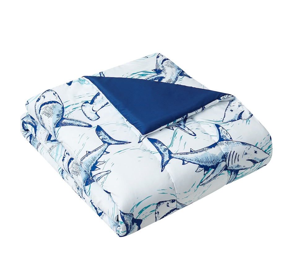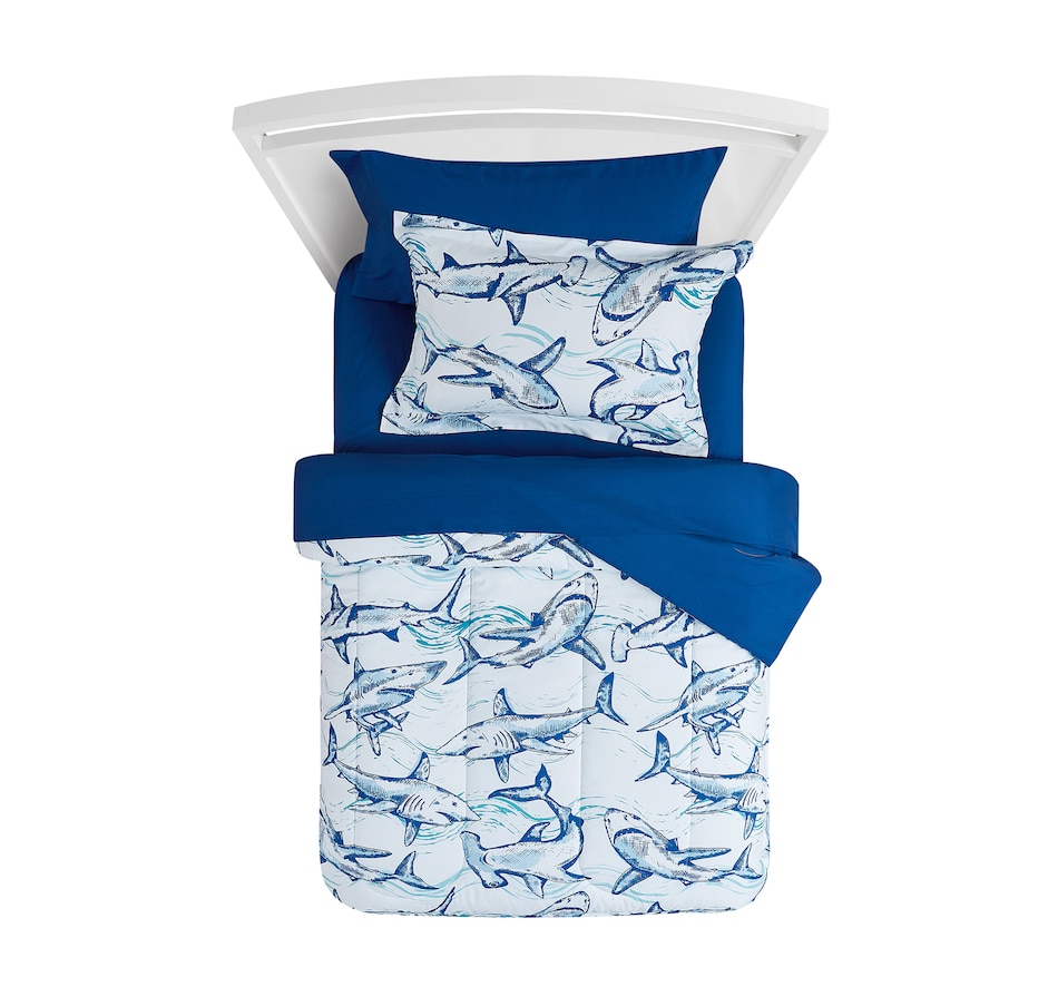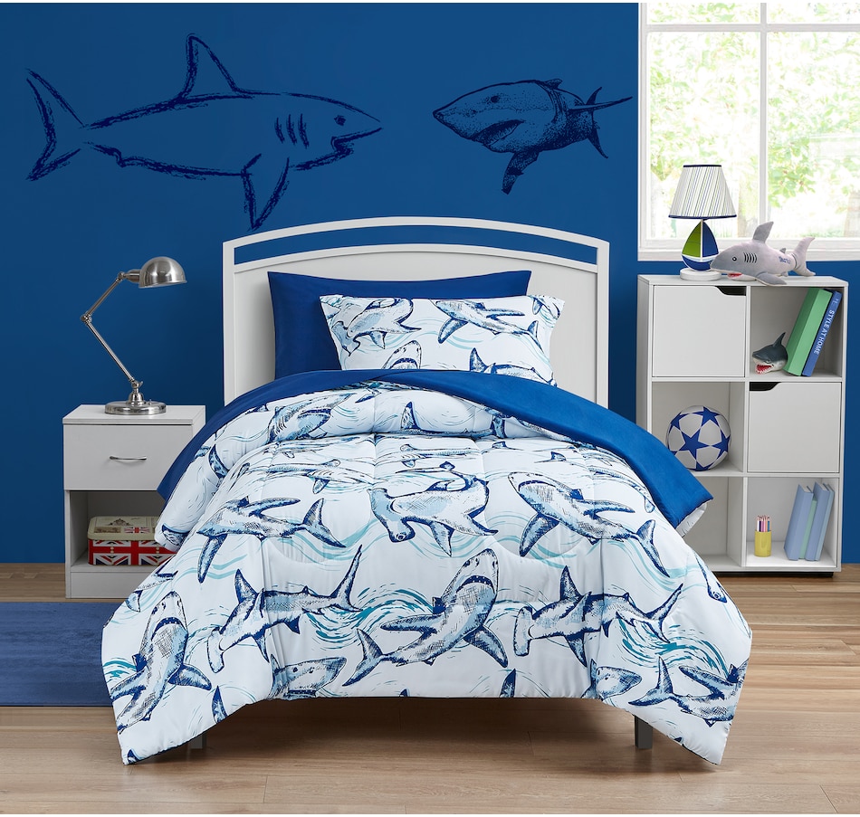 When it’s bedtime for a fierce swimmer, choose the Shark Bed In A Bag to snuggle up in! The set comes complete with a comforter, a fitted sheet, a flat sheet, pillowcase(s) and matching shams. This sharp pattern showcases crosshatch illustrations of the ocean’s apex predator on microfibre fabric that kids will find soft and snuggly. When it’s time to throw it in the washing machine, simply wash it in cold with like colours and let it tumble dry low before you shake it out and make the bed again.