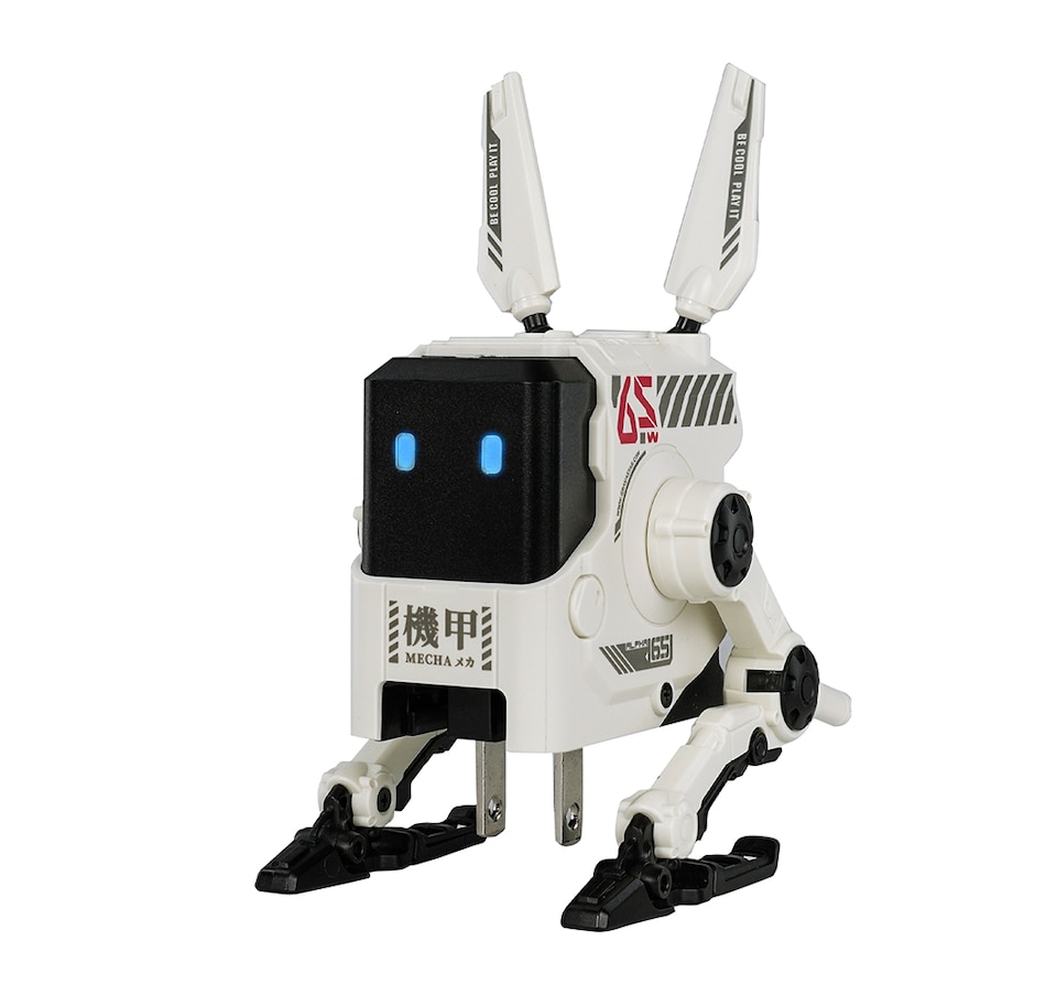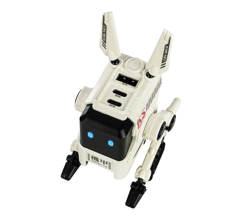 The mecha robot-inspired design transforms the charging of everyday devices. The Alpha 65W faster charger can shape shift to sit down for charging, or stand up for display, with ice-blue front lights that come to life when charging and provide a real-time power status display.