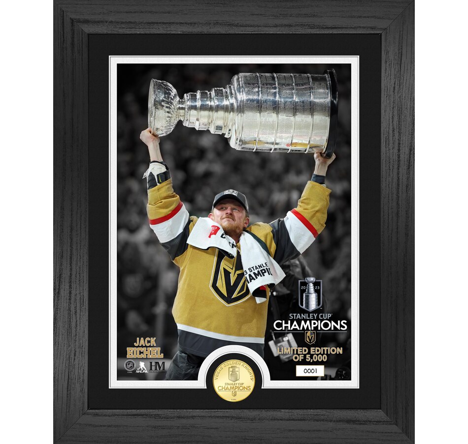 This 13" x 16" frame features in double matting under glass a hand numbered photo print of the 2023 NHL Stanley Cup Champion Jack Eichel of the Vegas Golden Knights raising the Stanley Cup, combined with a 39mm minted 2023 Stanley Cup Champions bullion bronze coin. Available in a limited edition of 5000 and officially licensed by the NHL and NHLPA, each frame is accompanied by a certificate of authenticity. This product is proudly made in the USA by The Highland Mint!