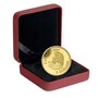 This 2014 $5 proof coin is struck in just over one-tenth of an ounce of pure gold, and features a three-quarter profile image of the bald eagle, its wide eye staring below its brow. The eagle's feathers are engraved so as to give dimensional details to the feathers and the sharp contours of its hooked beak. The front of the coin is engraved with the word "Canada," the date "2014," and the face value of "5 dollars."