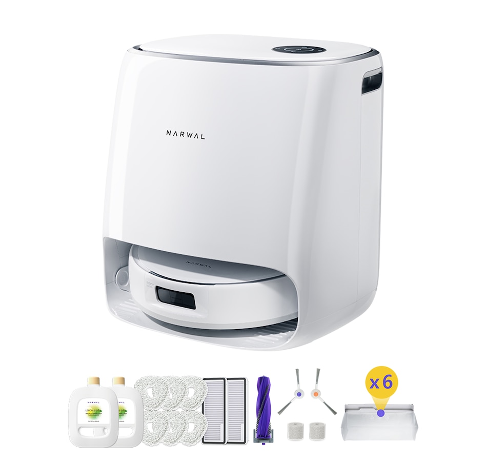 This Narwal accessories pack for the X Ultra contains two bottles of specially formulated floor cleaner, six mop cloths, two side brushes, a certified zero-tangling floating brush, two filters, two sponge filters, and six disposable dust bags.