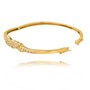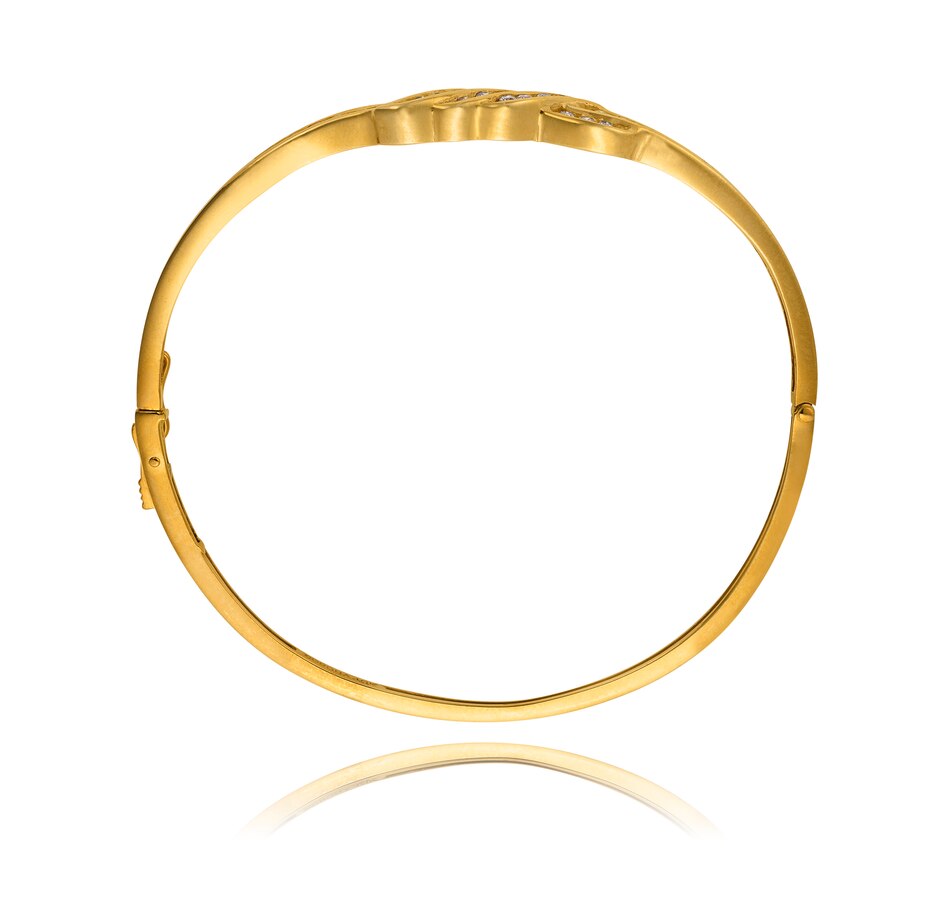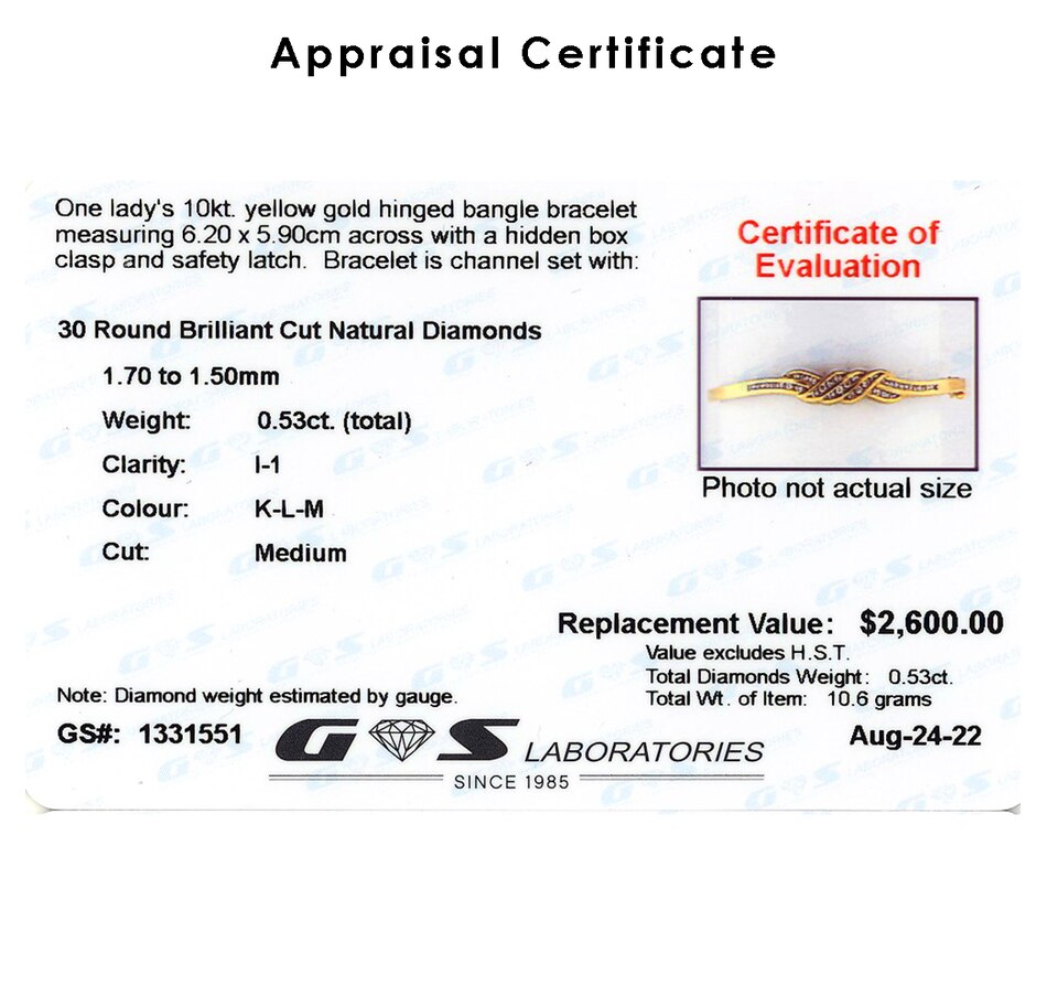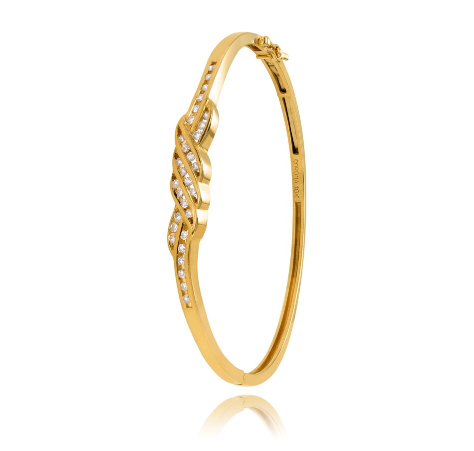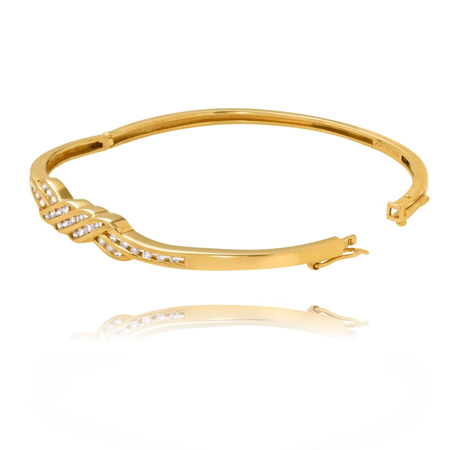 This beautiful yellow gold hinged bangle bracelet boasts a braided centerpiece that is channel-set with thirty round brilliant cut diamonds. Twelve of these diamonds are set into three waves, four per, in the middle. The solid portion of the bangle splits to provide a channel into which another twelve diamonds reside, six per side. And, this channel is overlapped by a smaller channel containing three additional diamonds per side, one at the top, the other at the bottom.