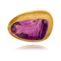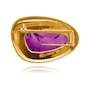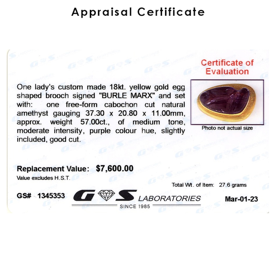 This museum quality custom-made egg shaped brooch is crafted in 18K yellow gold and contains a free-form cabochon cut amethyst weighing approximately 57.00 carats. The stone is mounted above a bezel of high polished gold that is slightly raised above a textured egg-shaped designed platform, signed "BURLE MARX". A double pin runs across the back with one side fitting securely into a receiver that revolves to hold and release the pin. Its matching ring is product #736069.