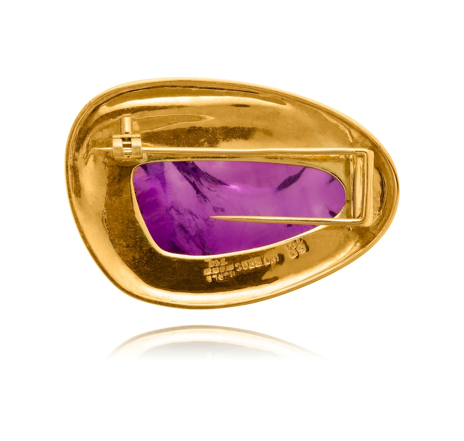 Custom Made 18K Yellow Gold Free-Form Cabochon Cut Amethyst Brooch, Signed "BURLE MARX"