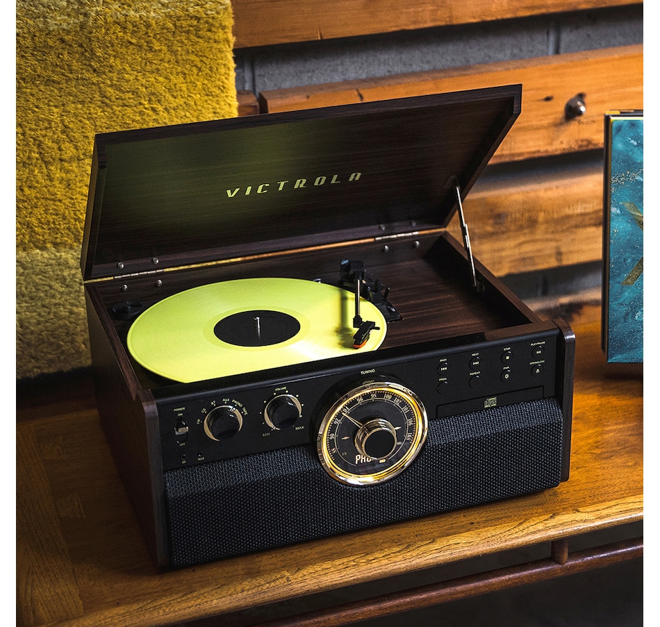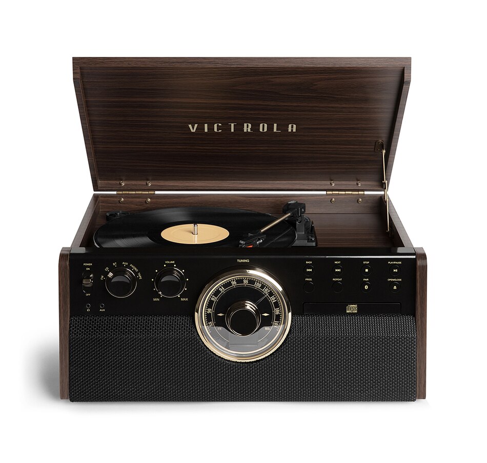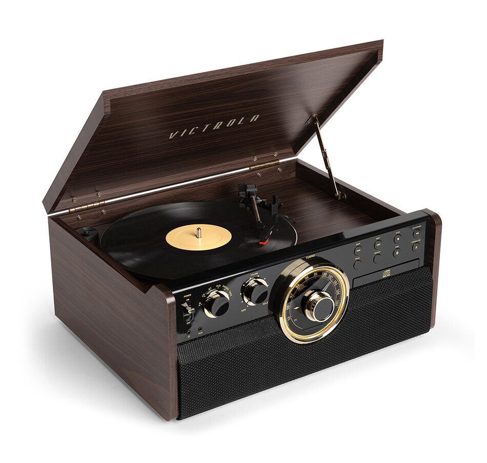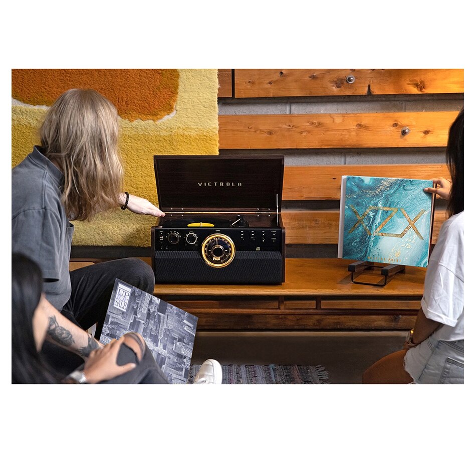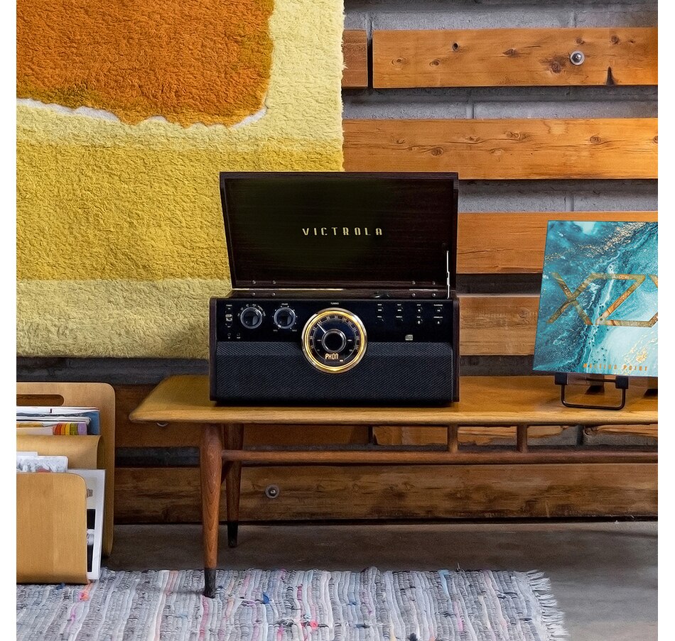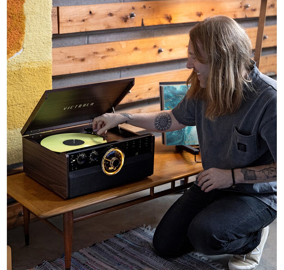 The Victrola Empire 6-in-1 Bluetooth record player perfectly encapsulates the spirit of mid-century modern style. Combining classic, sleek aesthetics with modern technology, it features a three-speed, belt-driven turntable, as well as wireless Bluetooth connectivity. The CD and cassette player, along with a 3.5mm aux-in jack, allows you to listen to any of your favourite tunes, or jam out to the built-in FM radio.