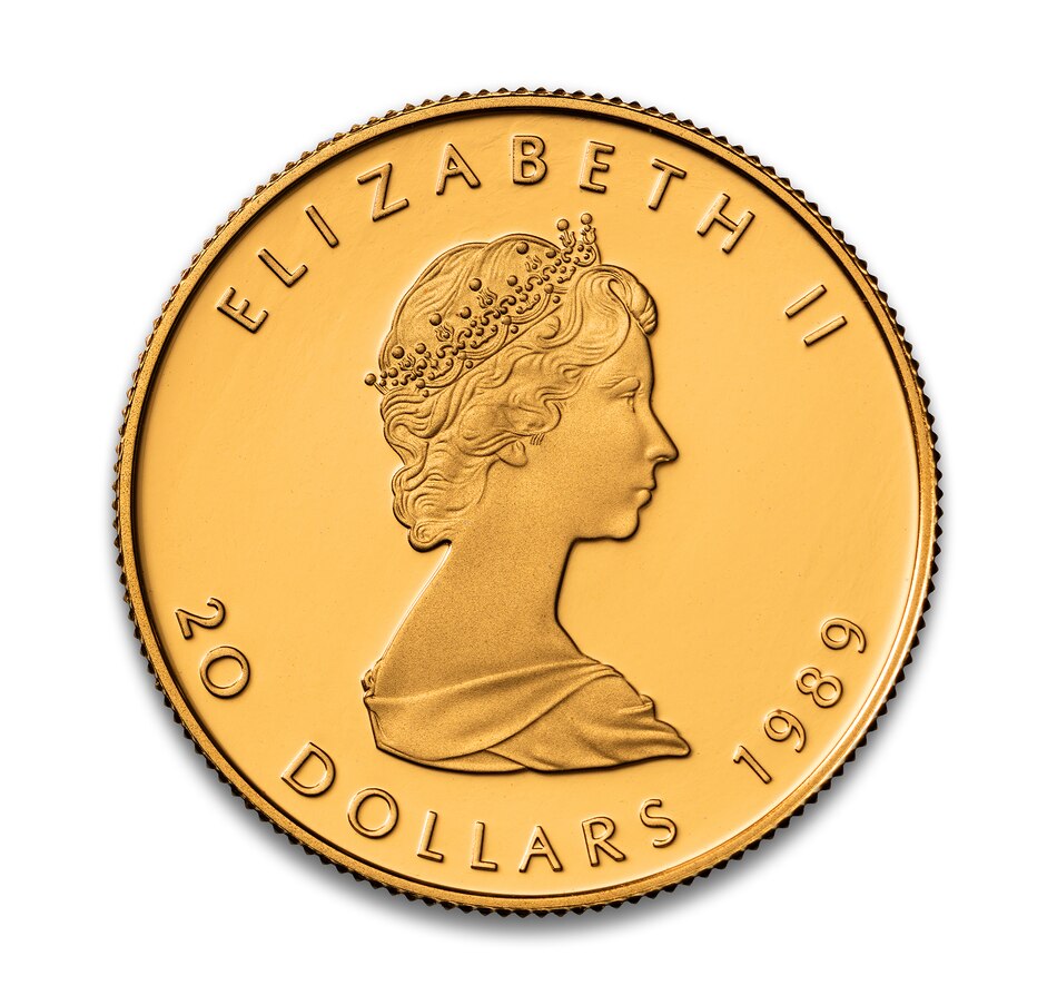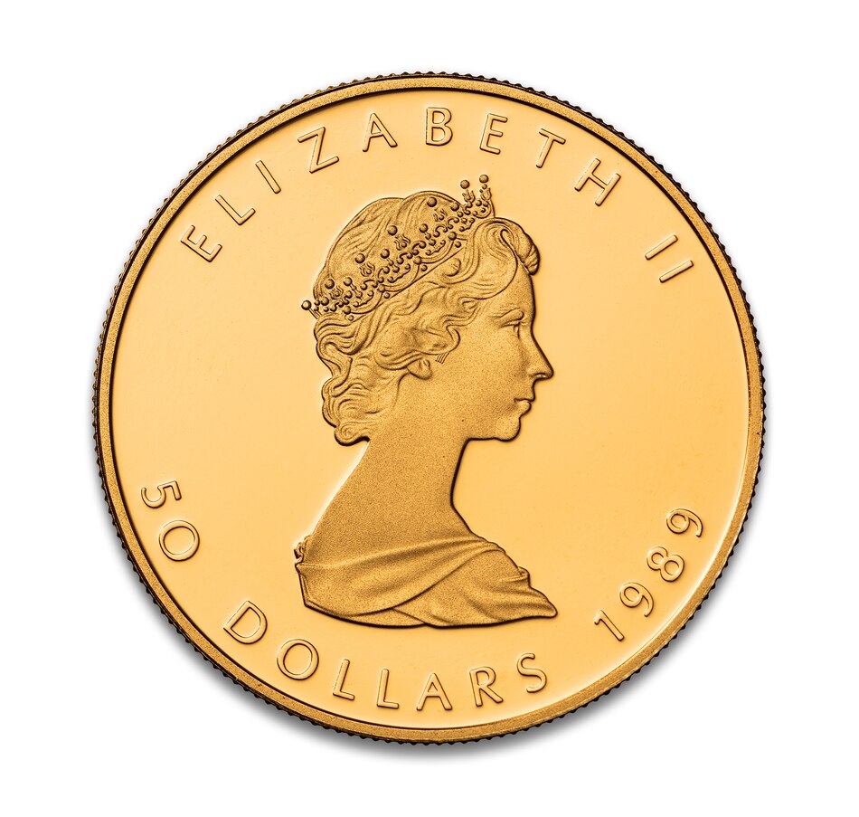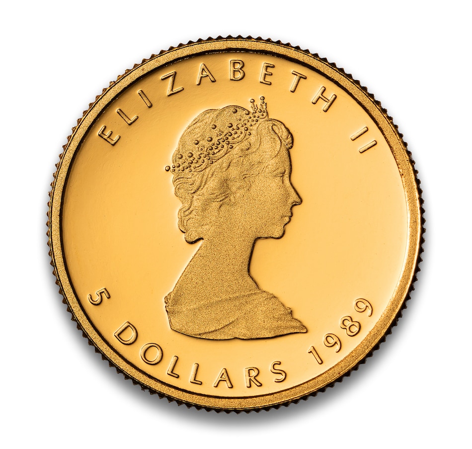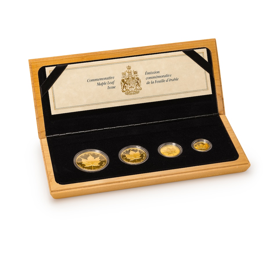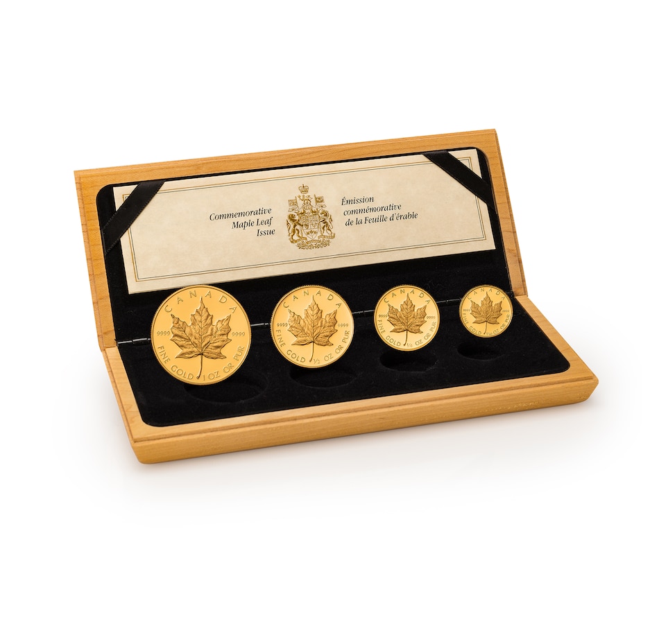 This four-piece limited collector edition gold maple leaf proof set was issued by the Royal Canadian Mint in 1989 to mark the 10th anniversary of Canada's first gold maple leaf coin introduced in 1979. The set features all four weights and denominations that were issued at that time, including 1-oz, 1/2-oz, 1/4-oz and 1/10-oz gold coins. Unlike regular bullion coins, the coins in this set are double-struck with a near-flawless frosted proof finish. On the reverse side of all four coins, Canada's maple leaf shines as a symbol of pride, tolerance and unity, while the classic effigy of Queen Elizabeth II graces the obverse.