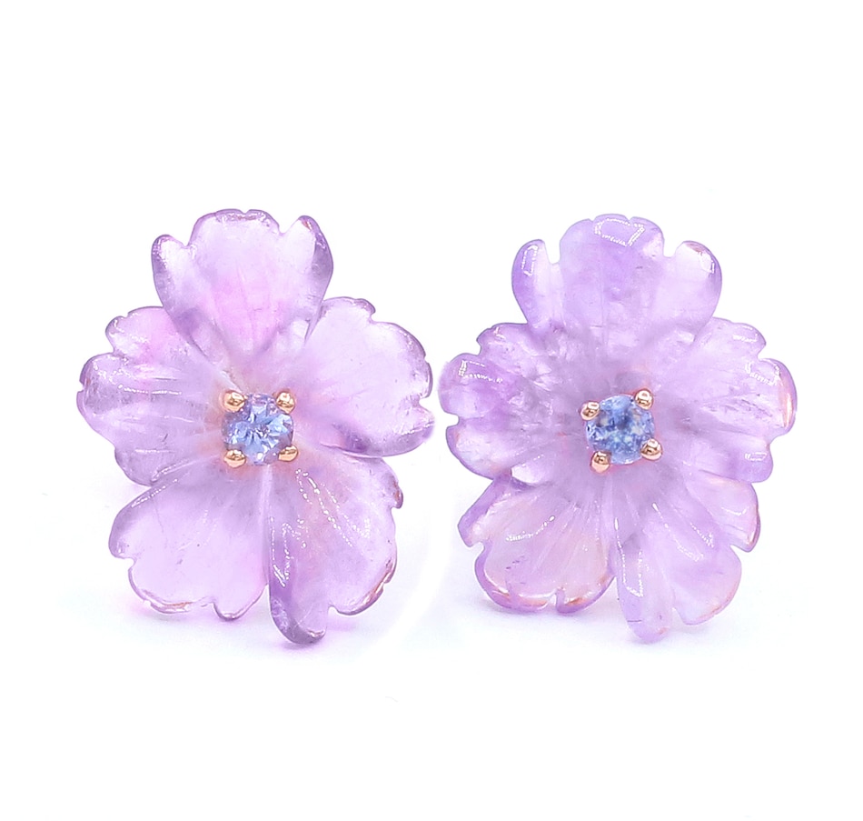 Palladium Silver Amethyst and Tanzanite Carved Flower Stud Earrings