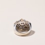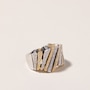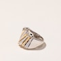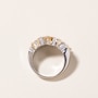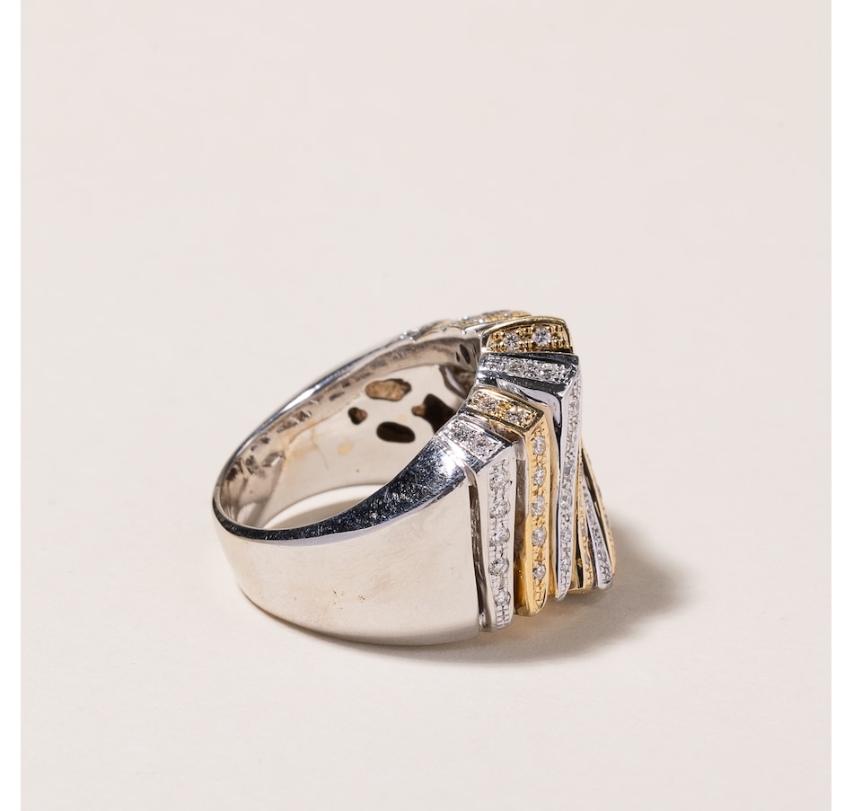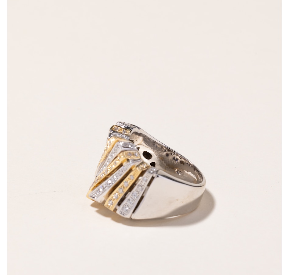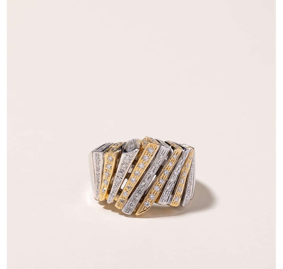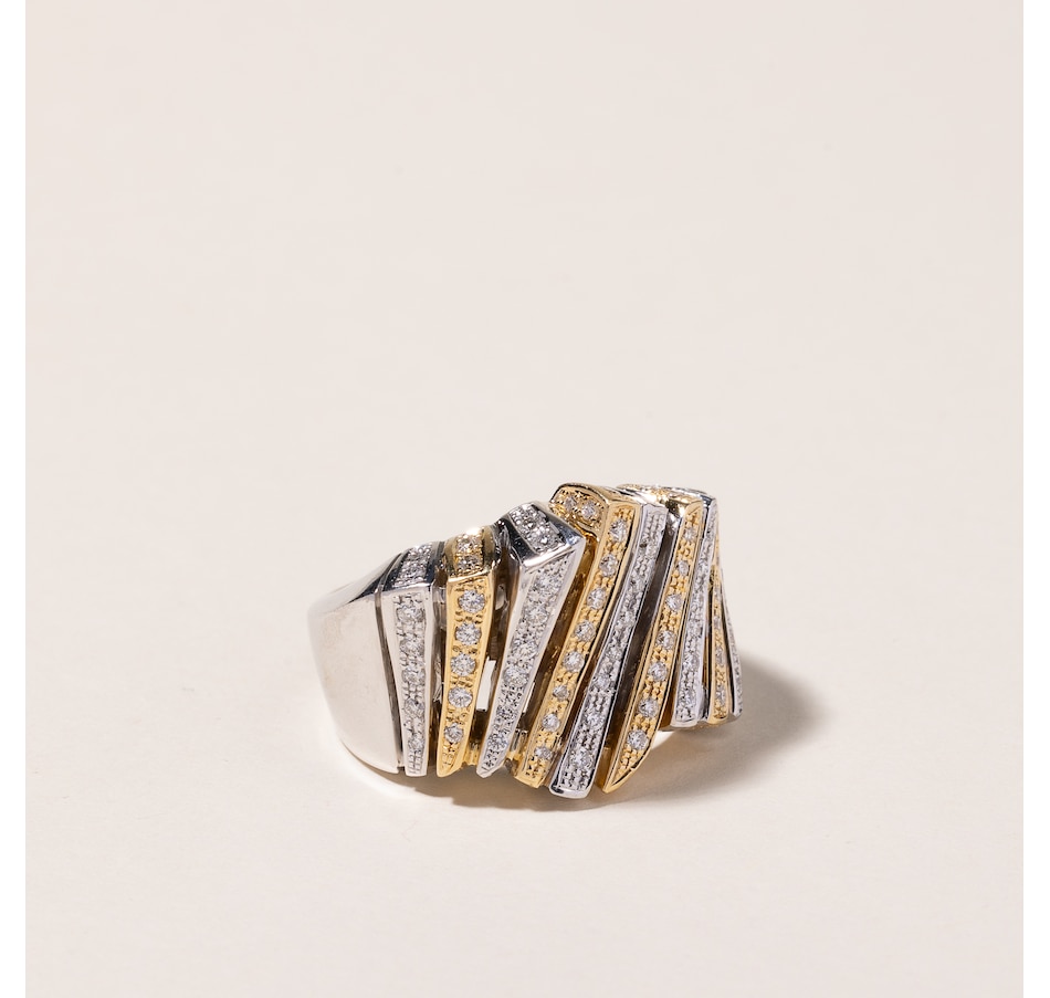 This impressive custom crafted architecturally designed ring shimmers with nine alternating white and yellow gold tapered bars, each angled and pave set with diamonds. Each of the columns fold down, on both north and south sides to reach the finger, and the longest bars are stacked toward the centre and become shorter as they span across the finger. Ninety round brilliant cut diamonds fill the entire surface quite dramatically, and culminate in a high polished 18K white gold band. The inside is pierced with geometric forms to rest comfortably against the finger.