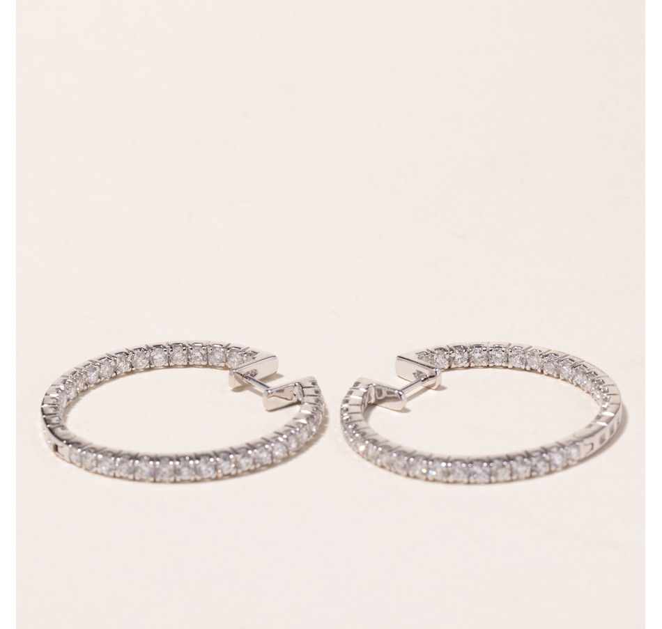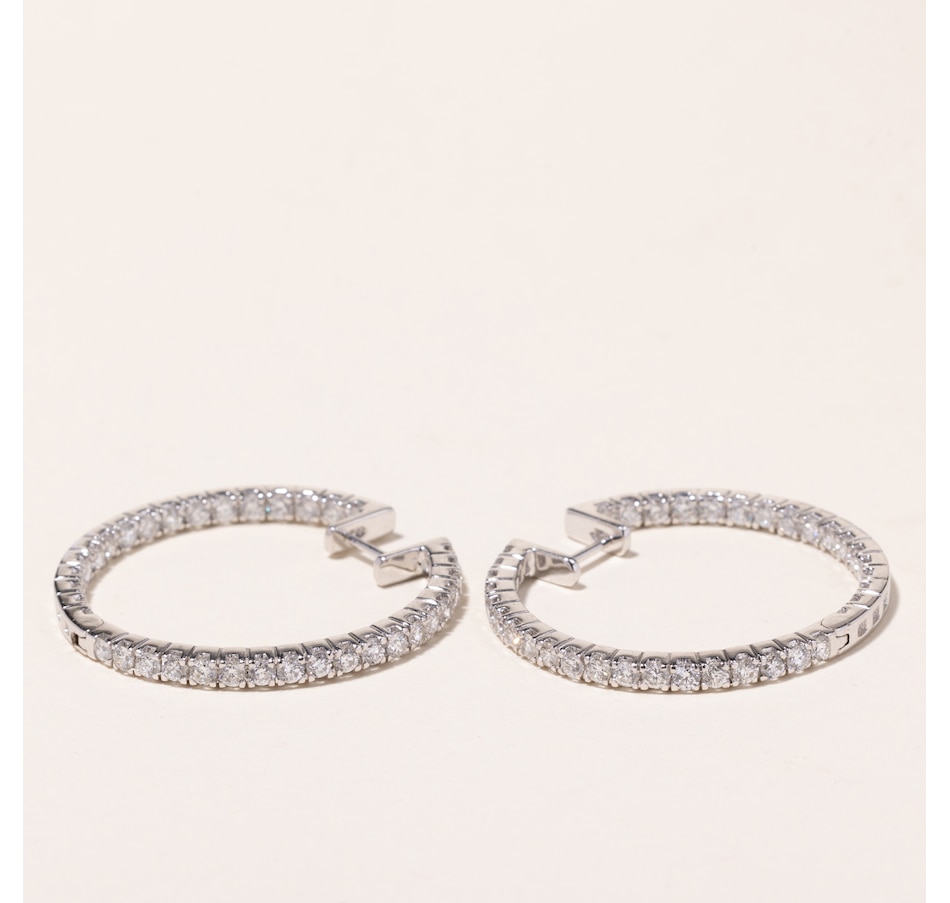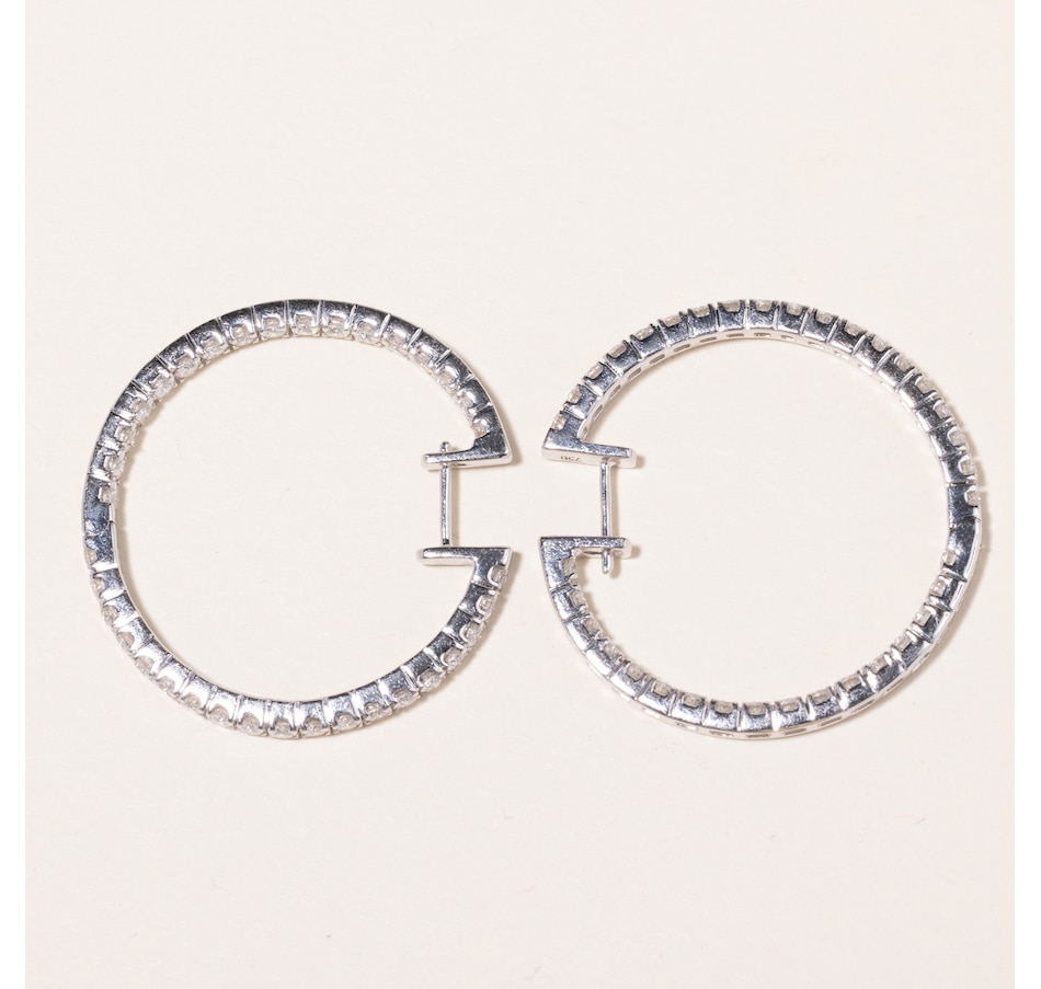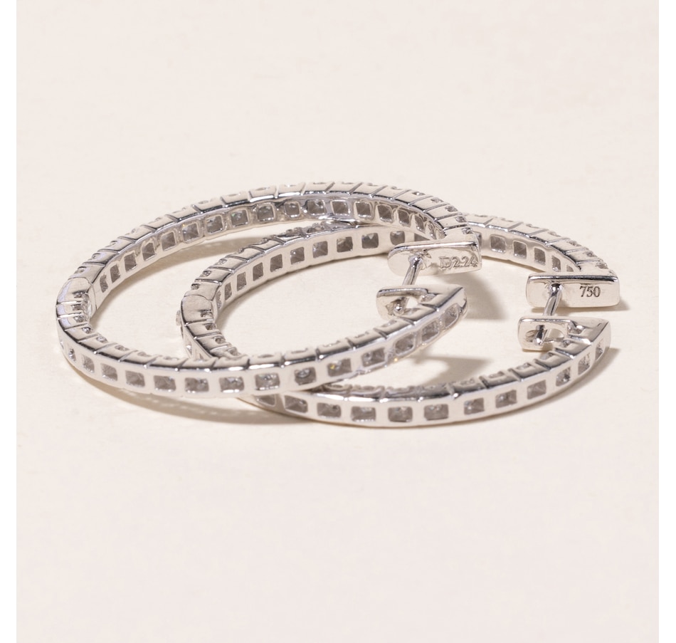 Regarded by many as a "must-have" in any jewellery collection, hoop earrings are timeless. Many styles of hoop earrings either focus on the metal that they are crafted from or feature a single line of stones. Inside-out hoops, on the other hand, showcase forward-facing diamonds that are lined up on both the outside as well as the inside portion of the hoop. This twist in design doubles the brilliance and maximizes the visibility of the diamonds, ensuring that they can be seen from every angle. These substantial 18K white gold hoops measure 1-1/4 inches in diameter and each feature 19 diamonds on the outside and 17 diamonds on the inside providing an elegant presence, and are seamlessly hinged to form a complete circle with post backs. The 72 diamonds combine for 2.24 carats in total weight.