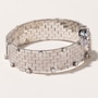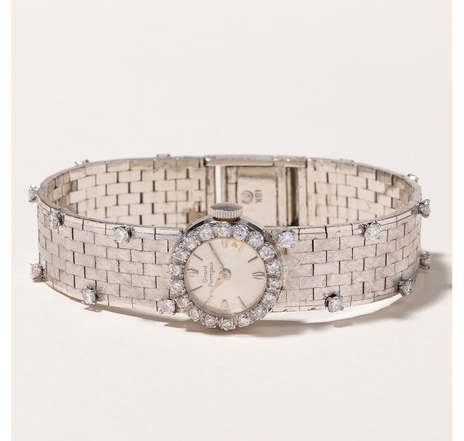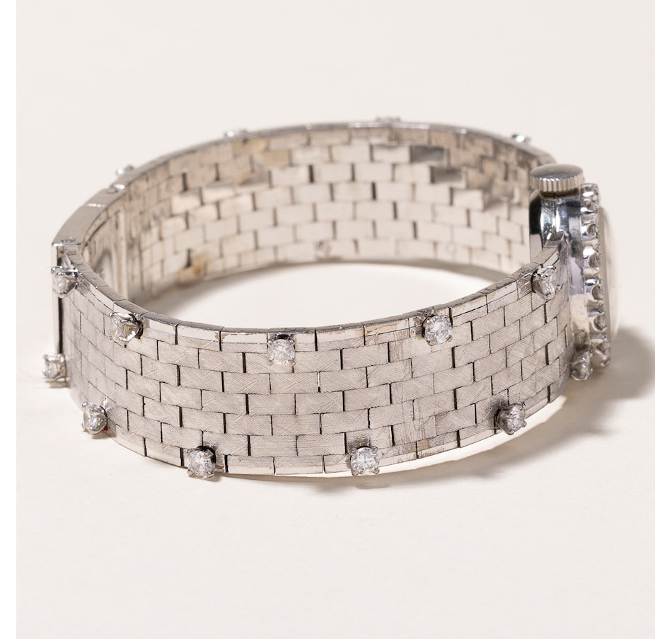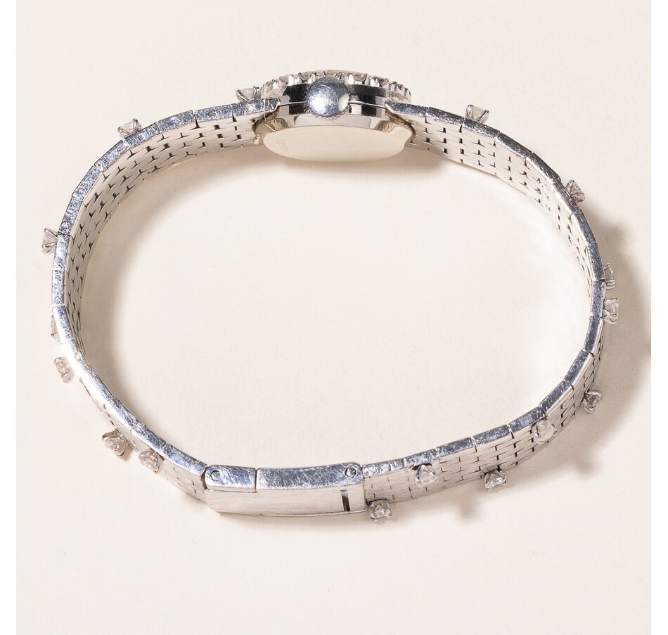 This stunning vintage 18K white gold ladies wristwatch, signed 'Girard Perregaux' has a 16mm round shaped case with a silver dial, featuring hour and minute hands and baton markers. It runs on a mechanical movement which requires winding. Twenty round brilliant cut diamonds surround the bezel and another eighteen line the edges of the textured gold bracelet. The thirty-eight diamonds combine for 1.46 av. ctw. The case back is stamped #73660555. The watch measures approximately 6.5" in length and the bracelet is 1/2" wide with a fold over clasp.