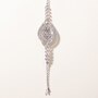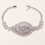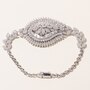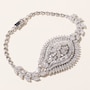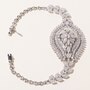 This regal, radiant, sensational and sparkling estate bracelet brims with 5.54 carats of bright-white tapered baguette and round, brilliant-cut diamonds. Elegantly custom-crafted in 18K white gold, this magnificent treasure presents a modified domed, teardrop-shaped, east/west centrepiece that centres a diamond-encrusted wrist chain embellished by leaf inspired diamond-set links. The focal point blossoms with an elongated floral interior framed with a row of 59 tapered baguette-cut diamonds, further framed with a row of prong-set round, brilliant-cut diamonds additionally enwrapped with a double row of round, brilliant-cut diamonds, which, at first glance, appear as marquise. Striking and utterly distinctive in design, this wonderful work of wearable art sparkles throughout with an entrancing array of 323 small bright-white round, brilliant-cut diamonds. Open oval links and hidden box clasp with safety add the final delightful details to this unique and dazzling bracelet.