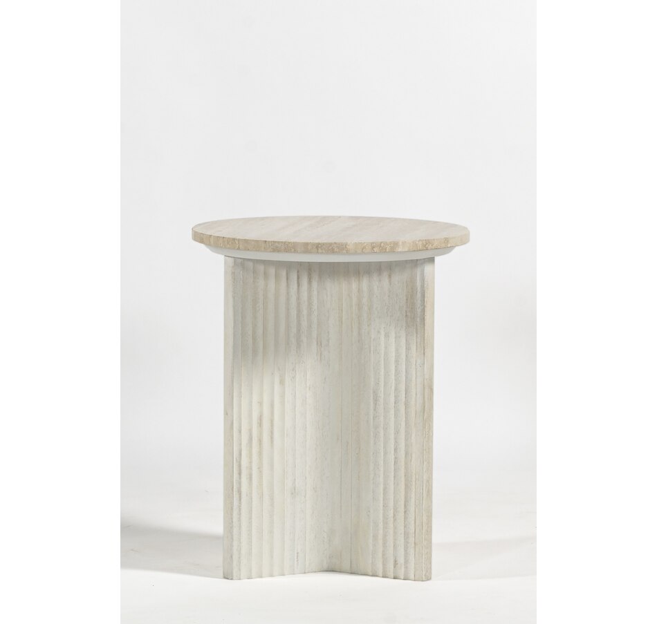 Designed with contemporary styling in mind, the Brassex Madison accent table features a solid mango wood base and a travertine top.