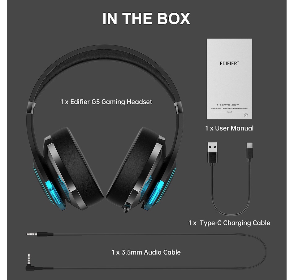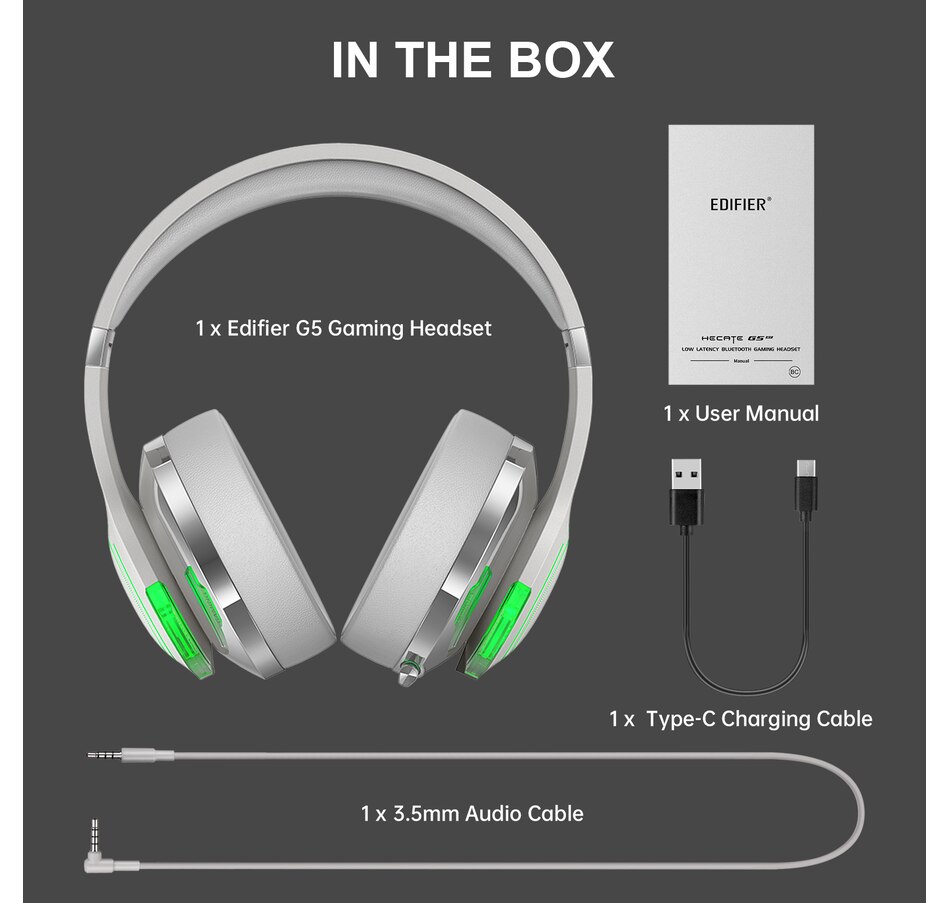 the edifier g5bt bluetooth gaming headset is easy to use and simple to operate. You can connect to bluetooth and enjoy a game-grade wireless experience or connect your devices with the included 3.5mm audio cable to enjoy lossless hi-res audio. With a powerful 40mm titanium driver and h specially tuned game sound effects, the edifier g5bt brings you a vivid sound field, clarity, and shock-feeling sound for an immersive gaming experience. High-capacity battery for 40 hours of use time with rgb lighting effects off, enjoy long-distance travel brought by uninterrupted music.