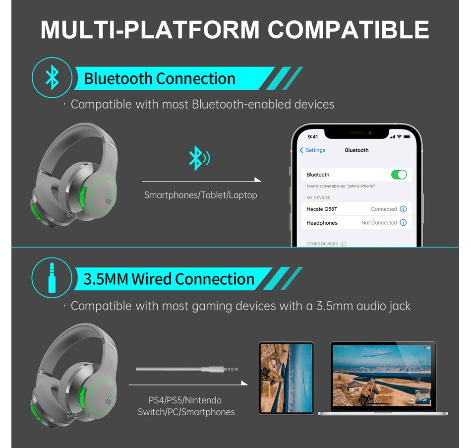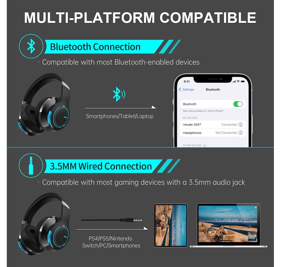 multi-platform compatible – bluetooth connection is compatible with most bluetooth-enabled devices. Wired connection is compatible with pc, laptop, nintendo switch, and more via 3.5mm audio cable.
