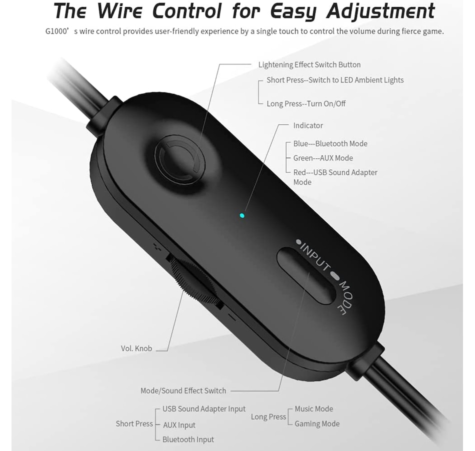 【the wired control for easy adjustment】the gaming speakers for pc with its easy wired control, offer user-friendly experience by controlling the volume, lights effect, gaming or music mode and the 3 input modes, like usb sound adapter input, 3.5mm aux input and bluetooth 5.3 input. With different colors indicators, you can clearly know what the mode it is.