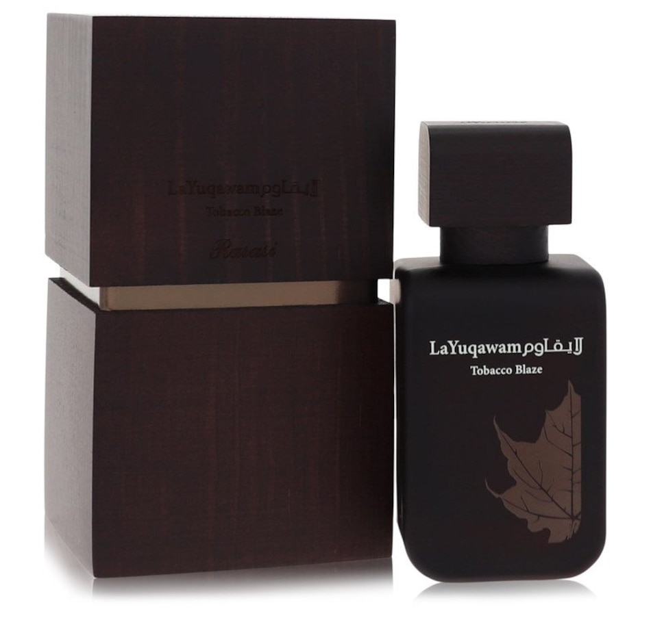 Tobacco Blaze is a bold blend of leathery and fruity accords. This Rasasi fragrance, introduced in 2013, opens with confidence and intensity with heady white floral notes of lily-of-the-valley and neroli, and rich, warm saffron as well. The heart of the cologne features several myriad notes, most notably the soft sweetness of apricot.