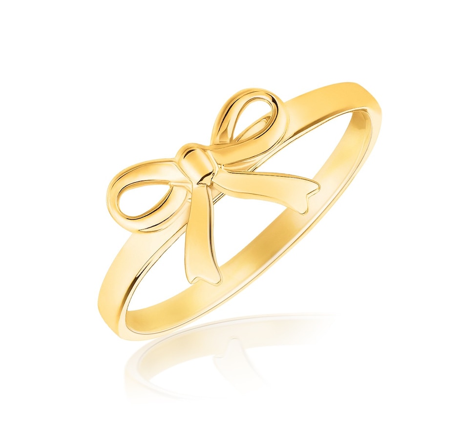 Demure and feminine, our 14k yellow gold bow ring is a stylish and lovely expression. Expertly crafted, the features include a bright polish and a ring band with lapped edges