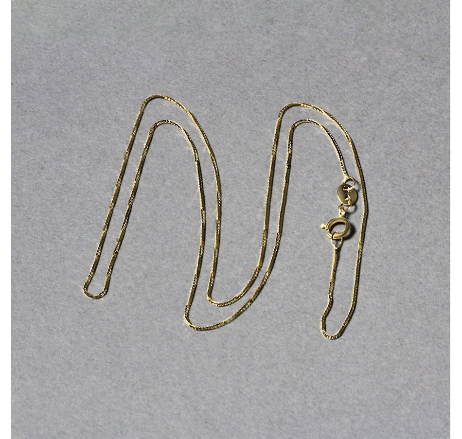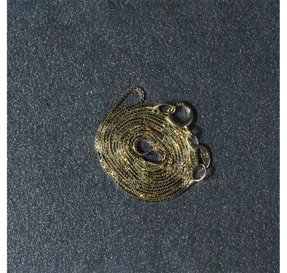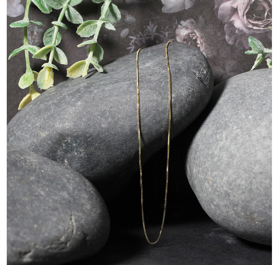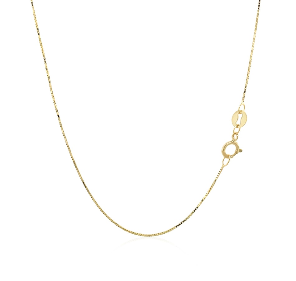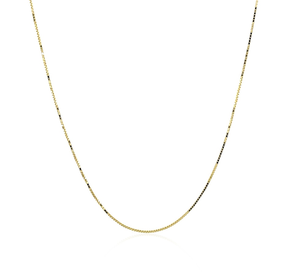 This classic box chain comes in 14k yellow gold and has a width of 0.6 millimeters.